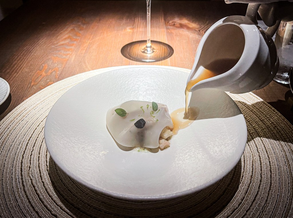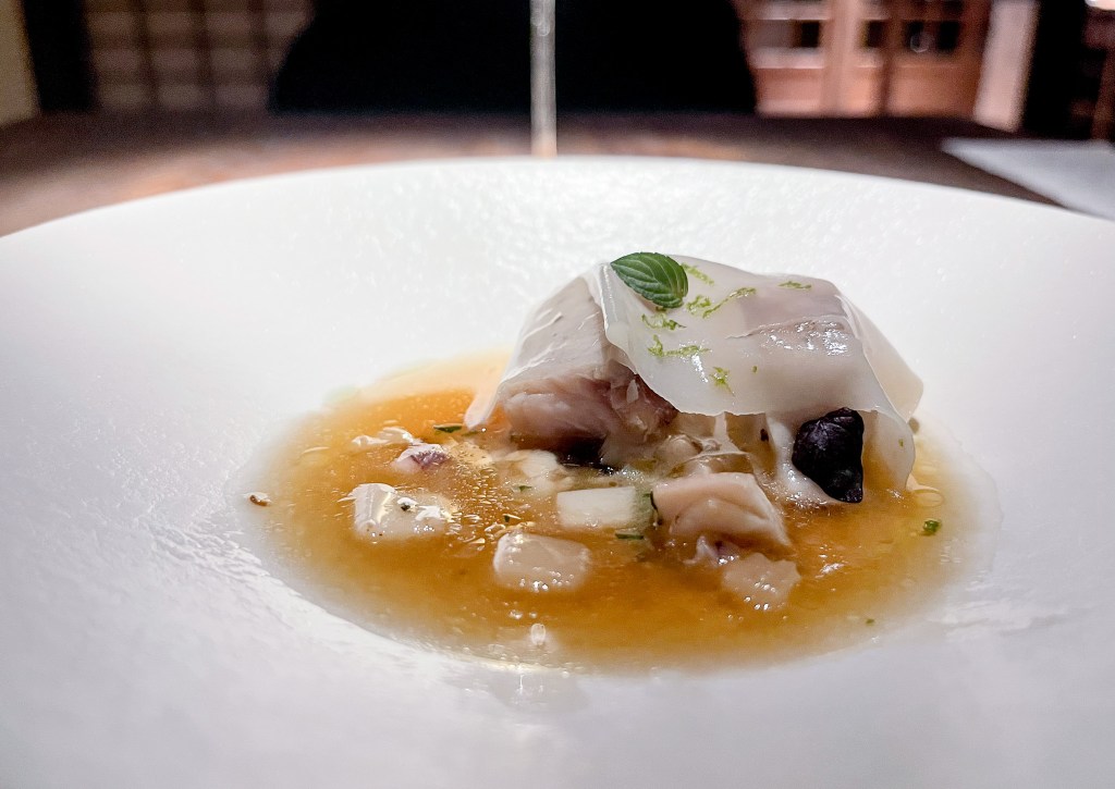 好的,第四道菜服務人員端來了,是「定置漁場魚、扁食」(Daily fish, Wonton)。