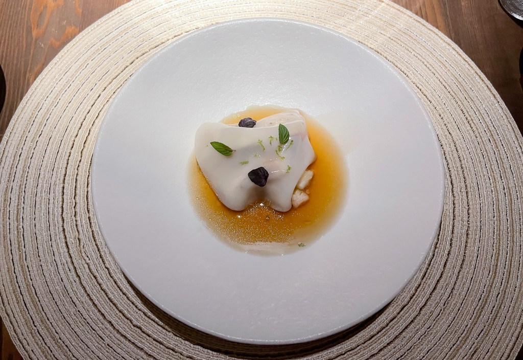 這道扁食的模擬太動人了,先不說可以把透抽的那種烤魷魚味帶出來,魚肉熟而溫暖且鮮甜,口感滋味十分理想。而外層的皮是米粉和小卷做成的吧(年紀大…忘記了)。