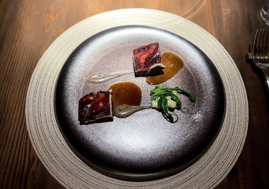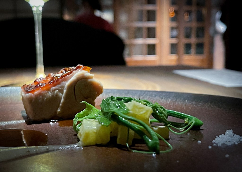 第五道是今日主菜,我選擇乳豬,這道是「乳豬、季節野菜、馬告青蘋果泥」(Local suckling pig , Wild Greens, Makauy and green apple purée)。