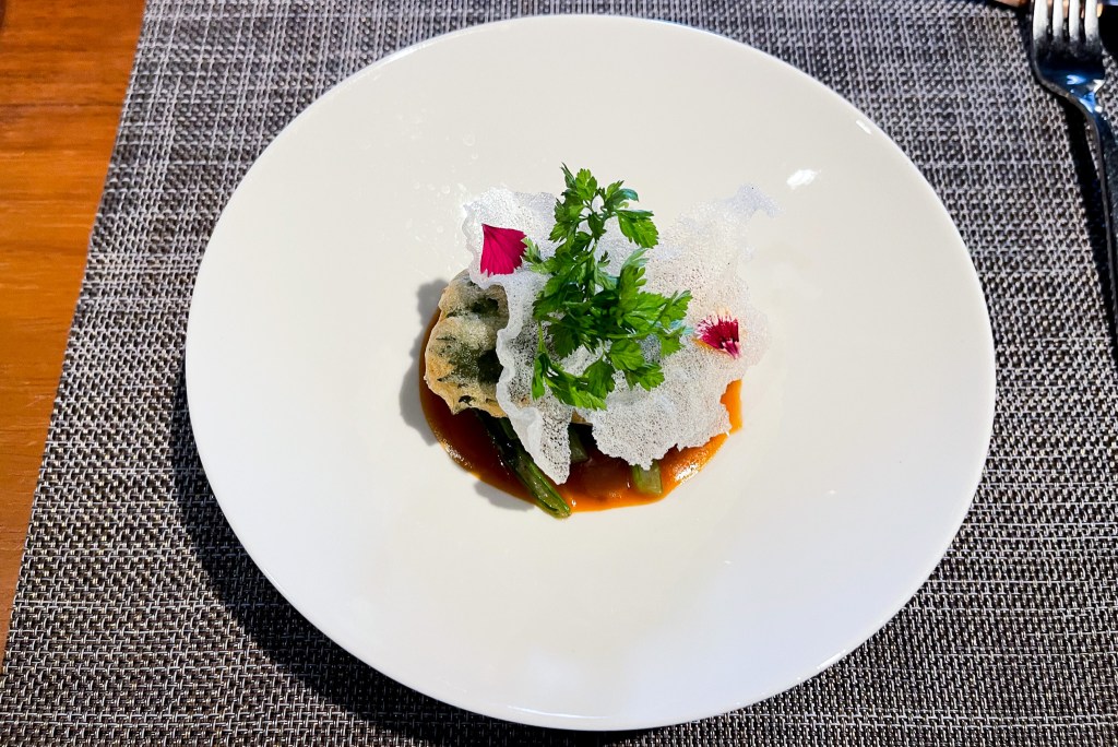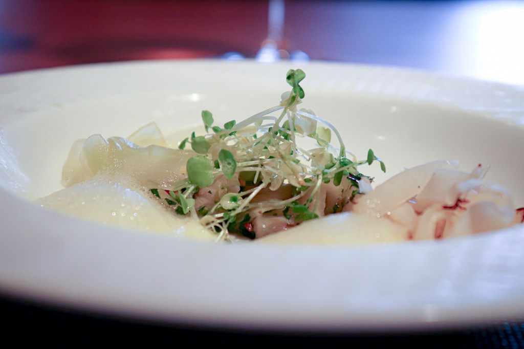 這道盤中,呈現的清爽豐富,也看得出廚師的技術水準,泡泡是柳橙風味,而旗魚切片襯底,一旁有經過炙烤透抽切絲,然後搭配著還有點青綠的蔬菜油等。