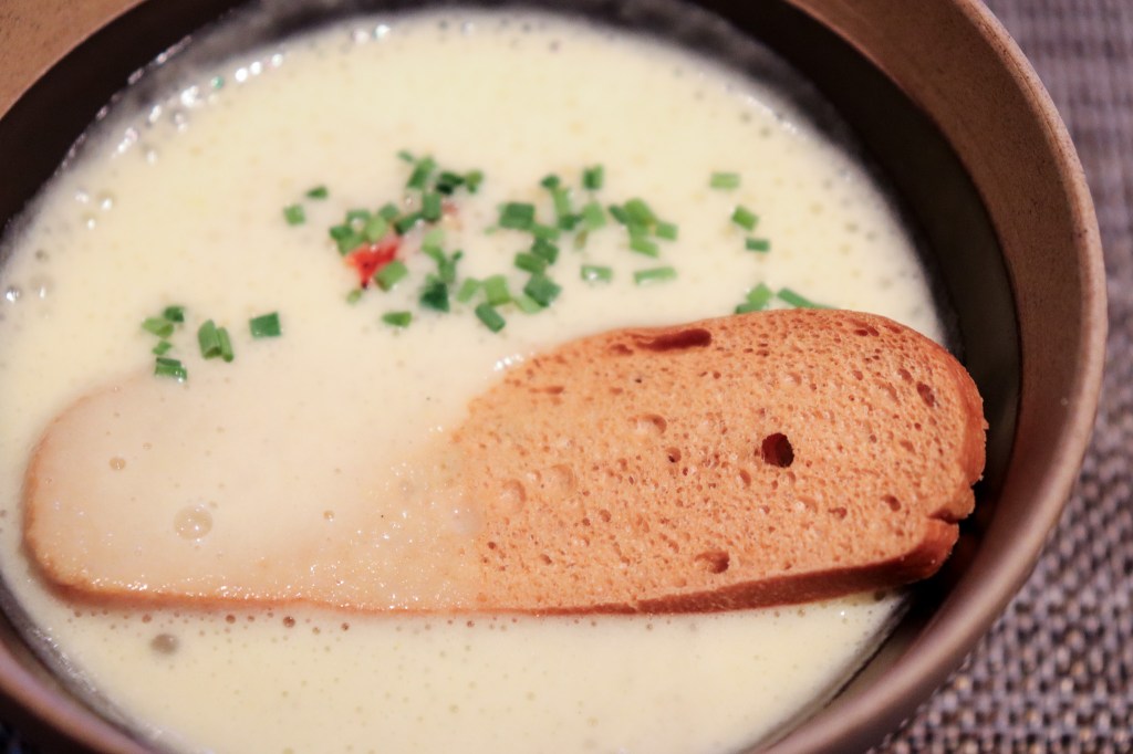 溫熱前菜後是一道有趣的湯品,是「馬鈴薯、玉米、蛋」(Potato, Corn, E99)