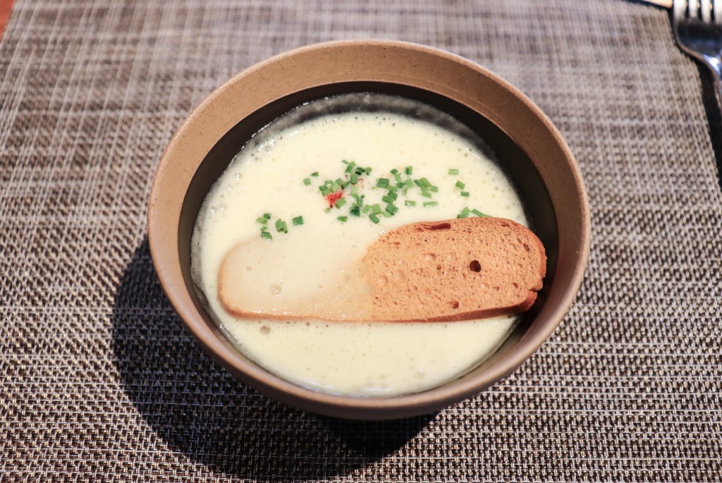 這道拆解玉米湯,一片餅乾搭配蝦夷細蔥,襯底有顆半熟蛋,這道攪拌均勻再吃,香濃也感受出玉米濃湯的滋味。