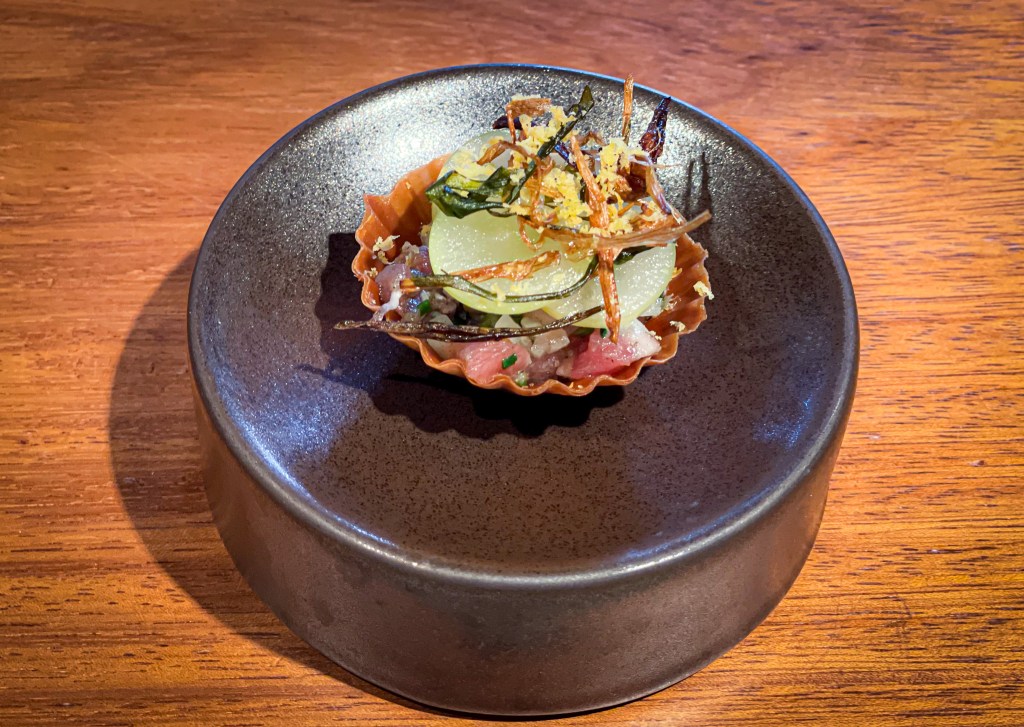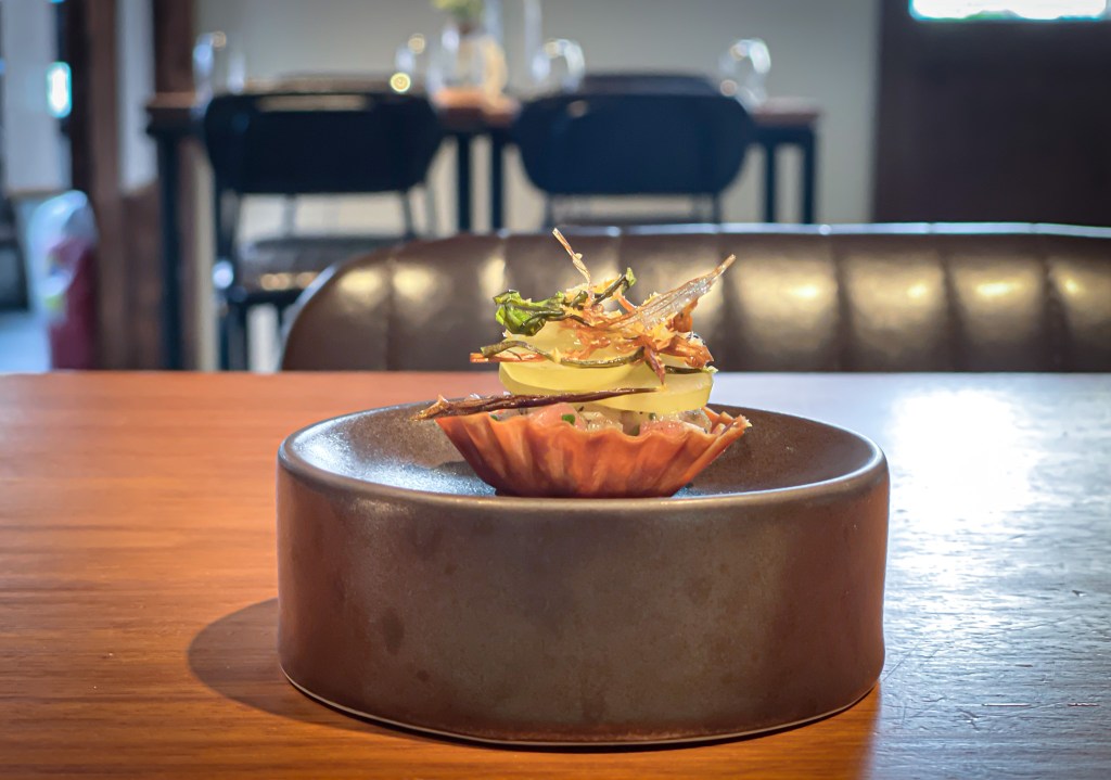第一道餐點Amuse Bouche開胃小點正在桌上,是一道小塊的塔派。