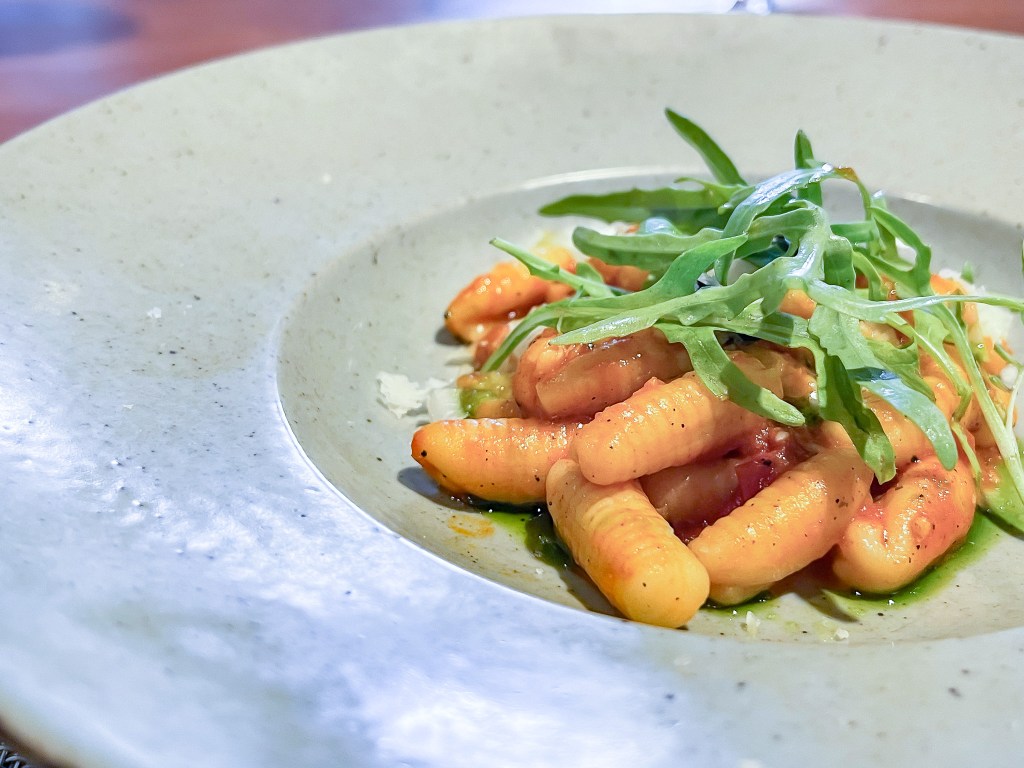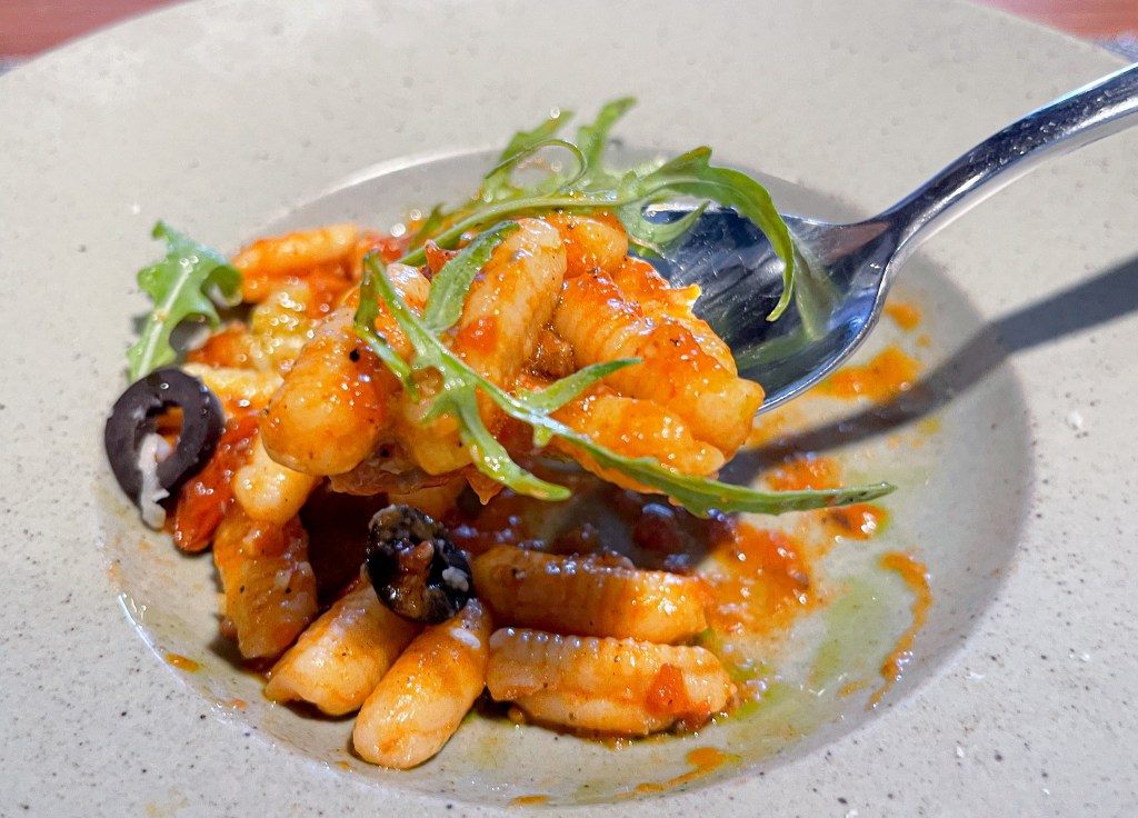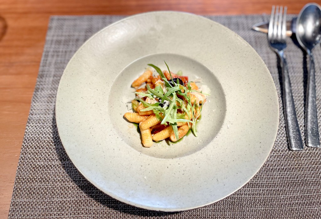這道是Gnocchi,如蛹般狀的義大利麵疙瘩,是以番茄、黑橄欖還有些乾酪、芝麻葉等等做為配料。