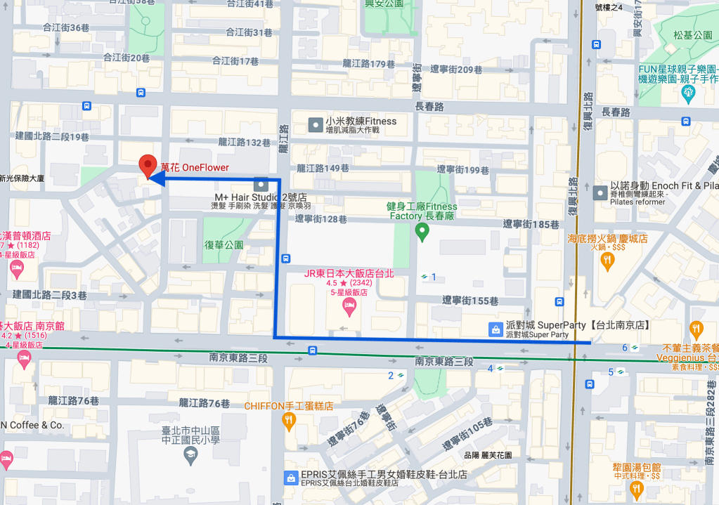 從臺北捷運松山新店南京復興站(G16, Nanjing Fuxing)→萬花 ONE FLOWER(25.03N, 121.32E)。