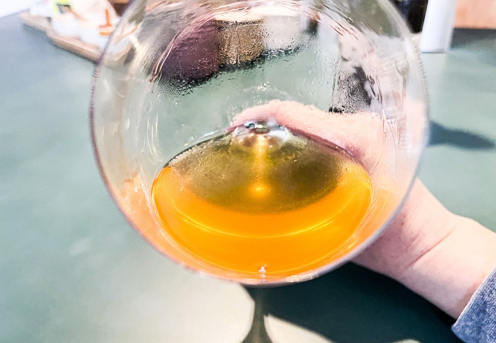 然後呈現一種如加州橙皮的橘黃但不是深,卻近紅調,又像是葡萄柚汁那樣,不過在稍稍換個角度而是深琥珀的色調。對,集中酒體即是深琥珀。