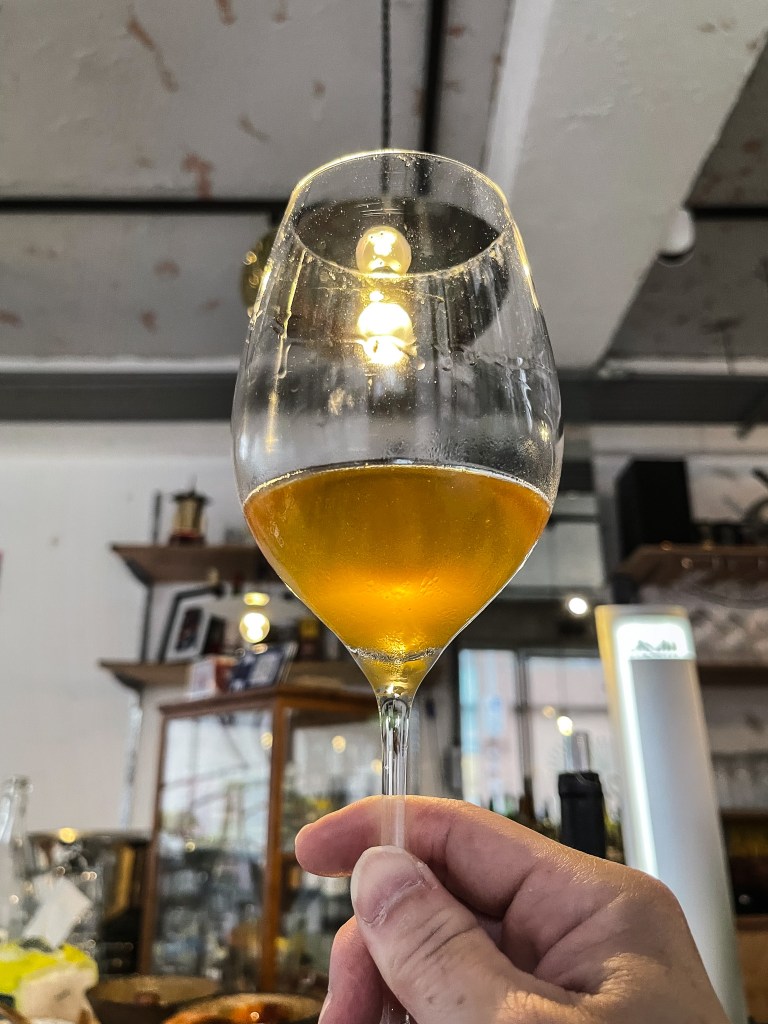 進入酒館後,有了位置,我也毫不猶疑地走向酒牆,然後選了一款橘酒,而且是斯洛維尼亞的橘酒。我也清楚大概是鹽礦味的,嚴肅滋味的,乾澀酸爽的。