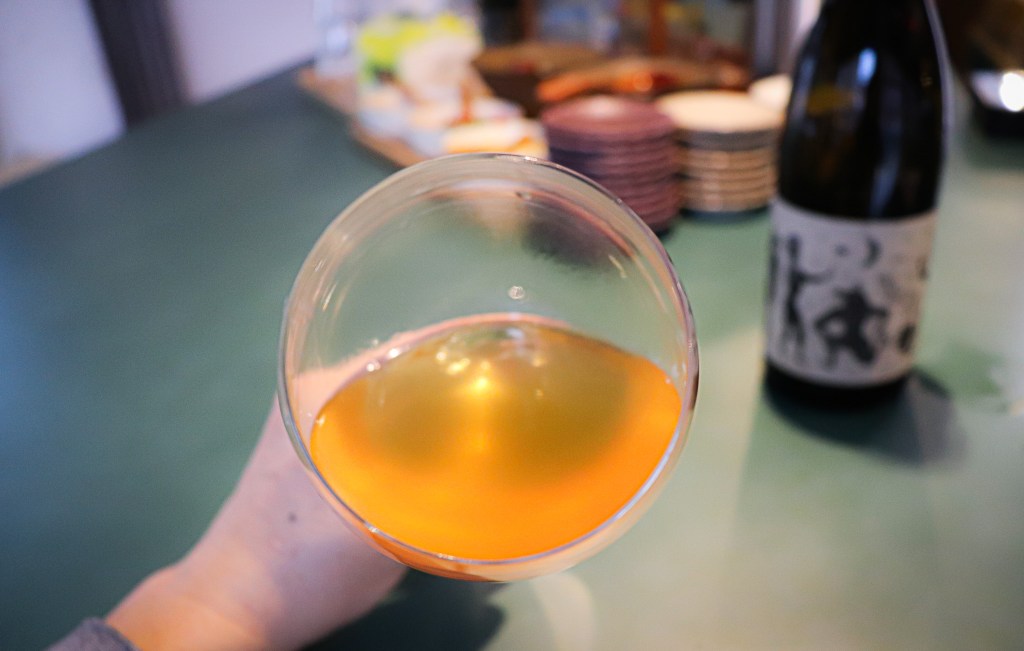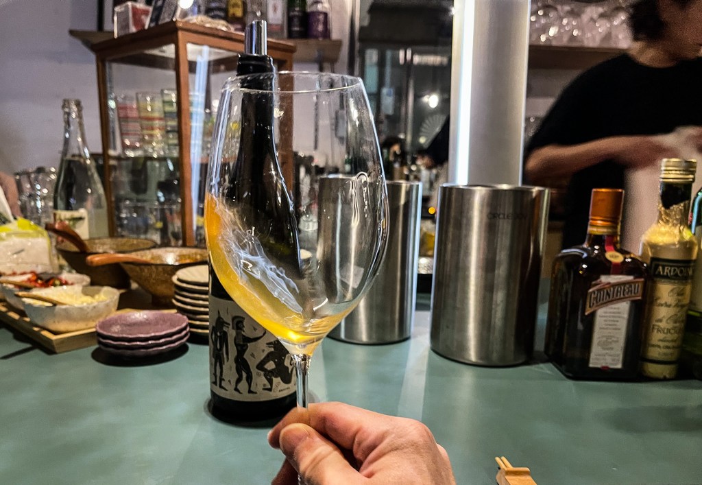 好的,在小酒館裡就不拘束任何形式,尤其在自然酒館當中,就是要輕鬆自然。當服務人員開完瓶,我接過葡萄酒後,一切就交給我自己來玩玩,品味這款橘酒吧!!