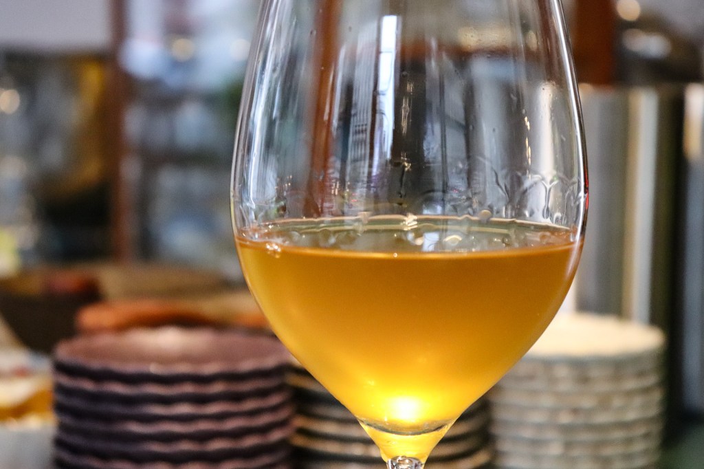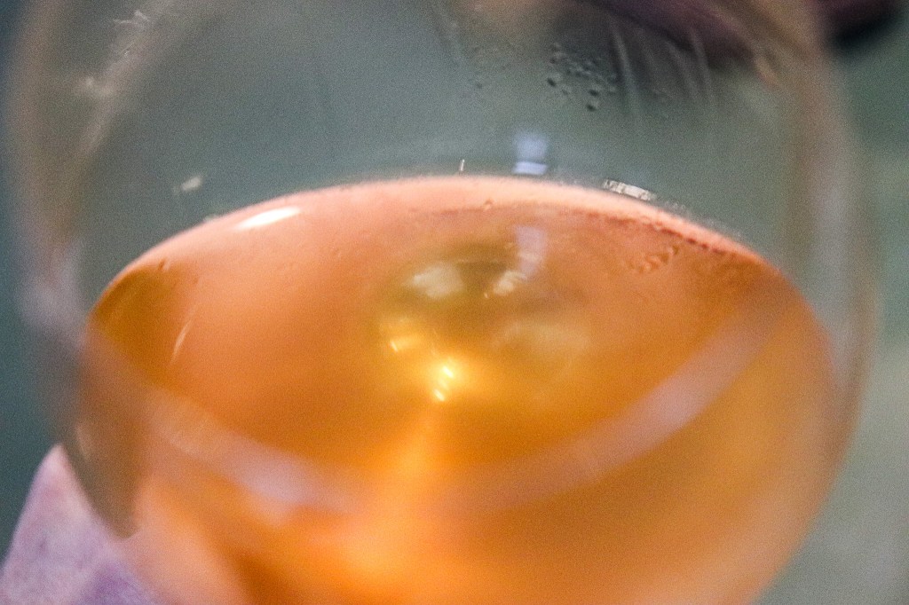 先觀察色調,沒錯這款酒一如我對東歐國家橘酒的認知,以深色的金黃,深琥珀,如黃金糖色調呈現..對,用更熟深一點的色調也代表著當地釀酒與陳釀方式的推敲。