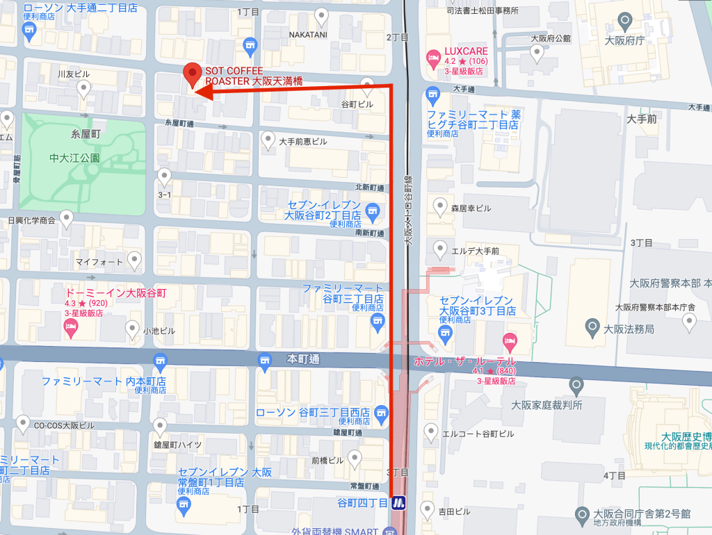 從大阪地下鐵御堂筋線梅田站(M16, Umeda)→大阪地下鐵御堂筋線本町站(M18, Hommachi)轉大阪地下鐵中央線本町站(C16, Hommachi)→大阪地下鐵中央線谷町四丁目站(C18, Tanimachi-Yonchōme)→SÖT COFFEE ROASTER ソットコーヒー大阪天満橋(34.41N, 135.30E)。
