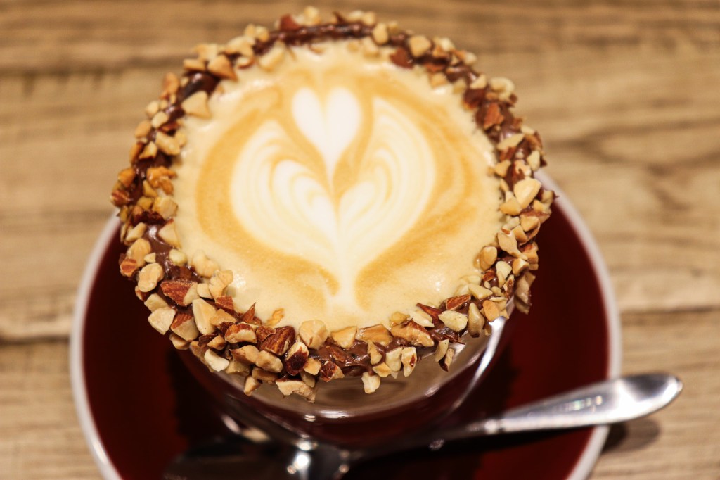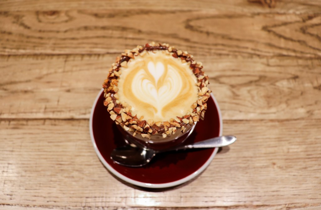 咖啡拿鐵溫度不會很熱燙,溫和柔潤型,喝到時溫順柔軟的口感因此帶出富裕的奶香,再吃到堅果和巧克力醬,帶出咖啡的本味。