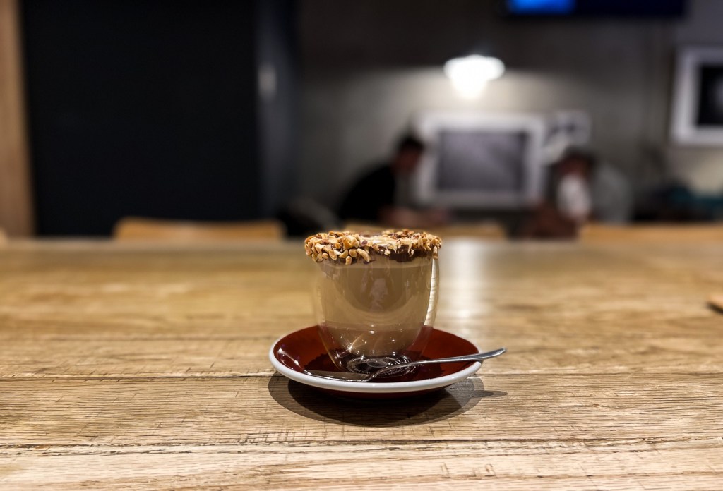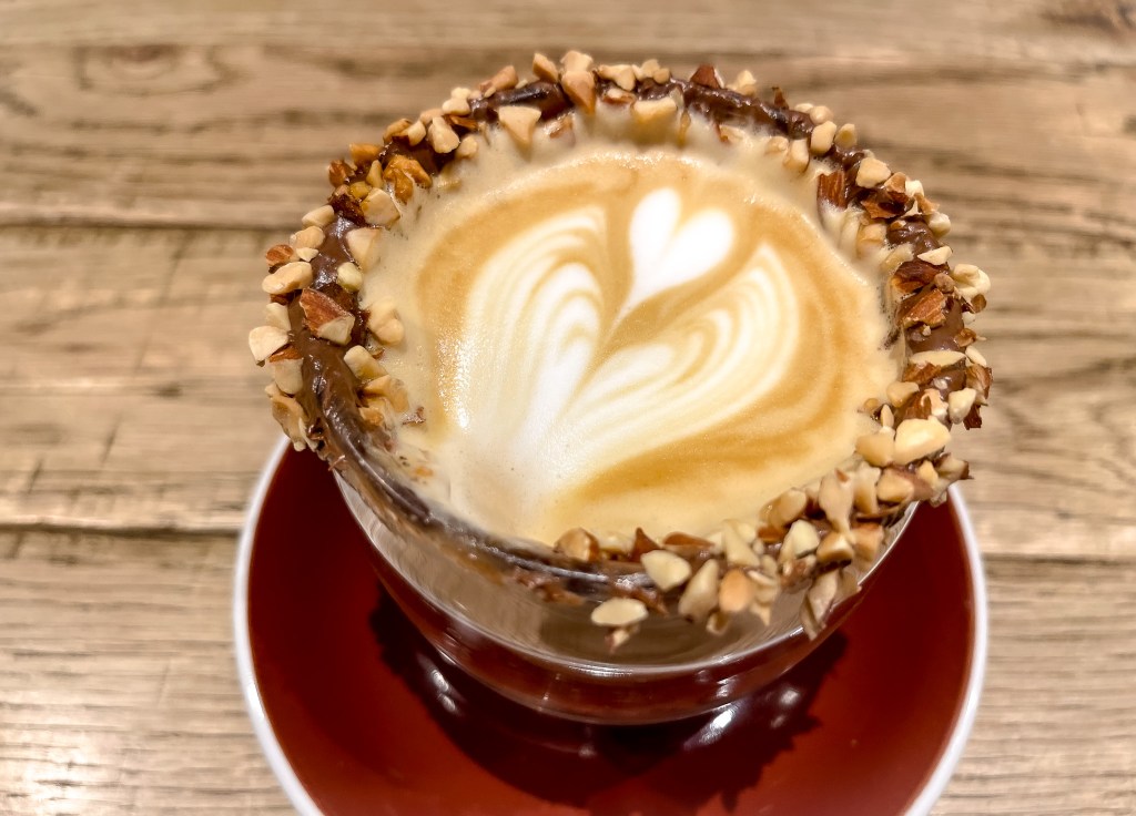 喝這杯的概念就像喝雞尾酒Salt dog一樣,嘴巴首先回對到脆粒堅果,而能夠沾上這些堅果的即是堅果巧克力醬(類似金沙巧克力的榛果巧克力醬內餡),而本質上這杯就是款拿鐵咖啡。