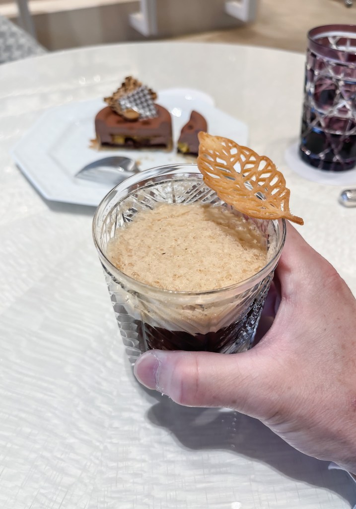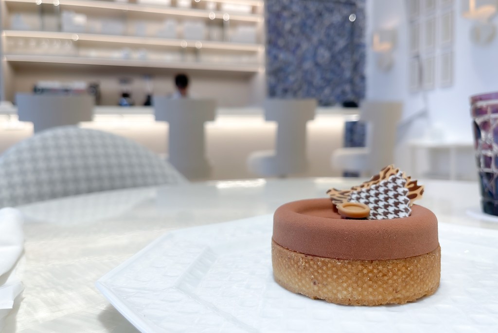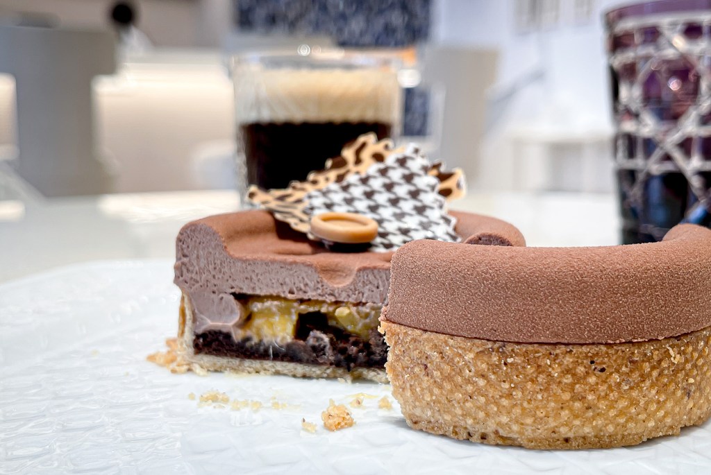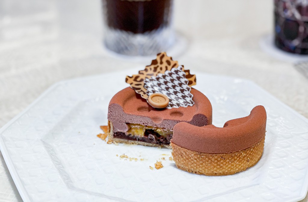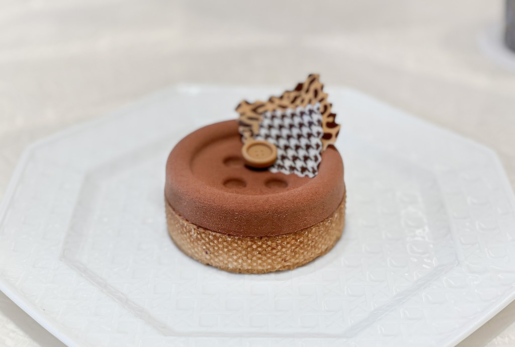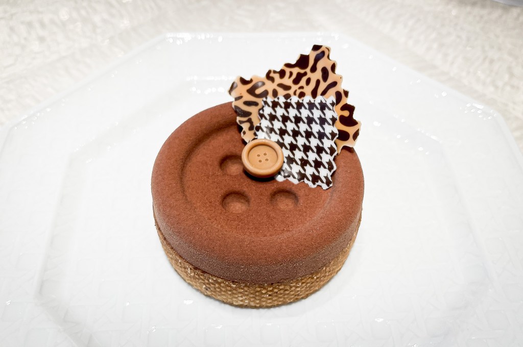 這塊點心送上時我就非常欣喜,第一是巧克力為主題,第二她的樣式是CD經典服飾的鈕扣模樣。尤其鈕扣與花紋Garnish都是巧克力而且是千鳥格和豹紋設計的巧克力。