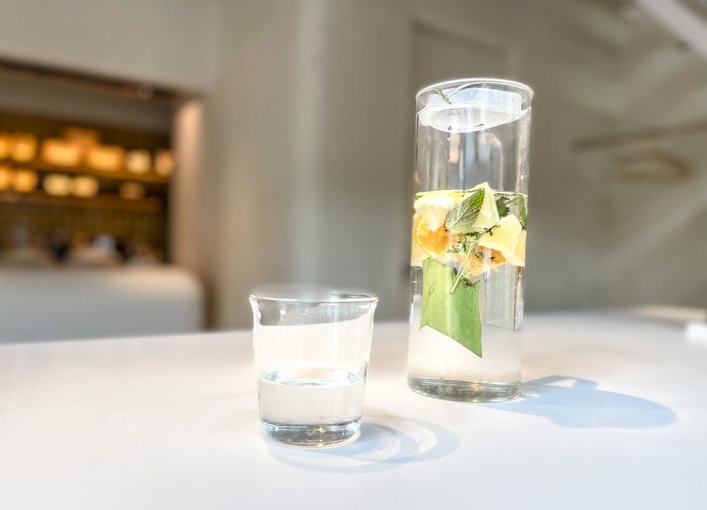 於是我坐在中島的位置,正前方則是工作人員的料理台,首先服務人員會送上一壺花果水,也就是用水果與香草直接浸泡於水的飲用水。