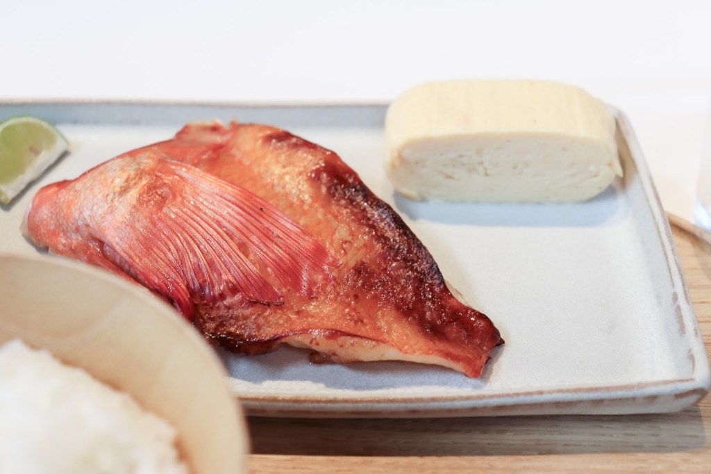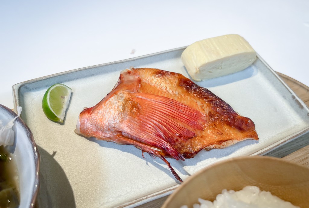 好的,定食中第三樣為主菜「金吉魚(喜知次魚)」搭配高湯卷玉子燒。