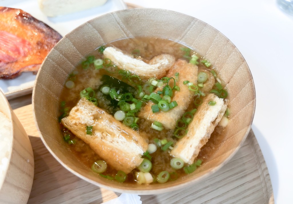 定食中的第二樣是「味噌湯」Miso Soup,當然不僅是湯而已,這味噌湯有加蔥、海藻和炸豆腐。這款湯也是現場製作,將味噌溶解在湯頭後,則將湯裝入碗中。所用食材有北海道產的頂級的藏籠3年利尻海帶以及來自鹿兒島產的金槍魚魚乾、鯖魚片和宗田節(即鰹魚的一種“宗太鰹”)。而味噌的種類包括用長野縣的經3年陳釀糙米味噌、米味噌和白味噌等等。而蔥則用在地京都所種植的有機青蔥,海藻來自宮城縣以及一塊京都產的炸豆腐。