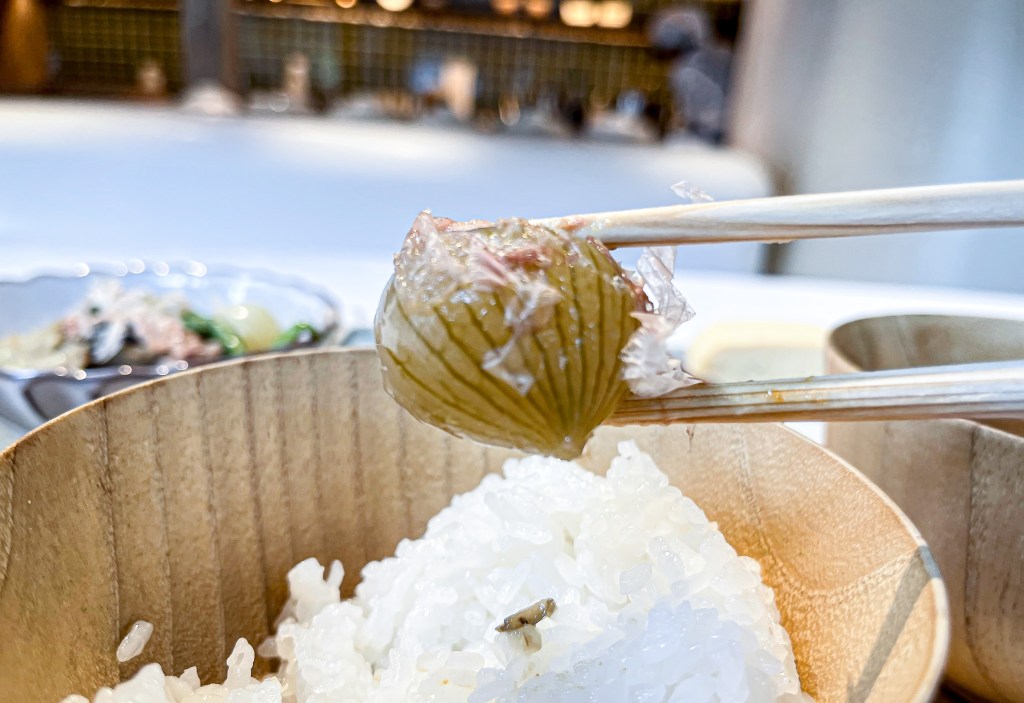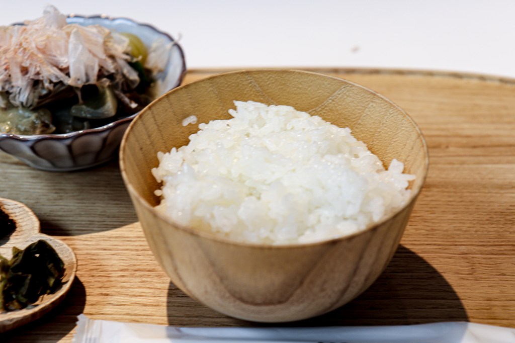米飯是一款用自然無污染的日本米,而所謂無污染所指的是不使用殺蟲劑、不使用任何肥料,是一種自然栽培的水稻混合。餐廳強調米是當天早上由合作的米商送達新鮮的米,抵達後就開始作業,完成拋光(新米經拋光後表面潔白光滑)然後在陶器鍋中煮熟。