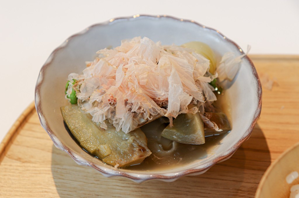 第四樣配菜是一碗「蔬菜」。而這碗蔬菜裡有,淡路島產的煮熟小洋蔥,賀茂的茄子、伏見的辣椒和自然無農害的鴻禧菇,還會添上鰹魚片等等,還有一條糯米椒。