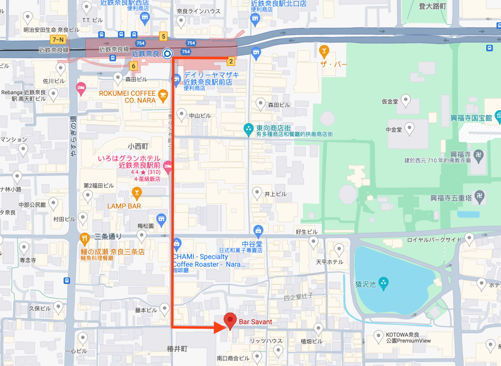 從近畿日本鐵道近鐵奈良線奈良站(A28, Kintetsu Nara)→BAR SAVANT(34.40 N, 135.49E)。
