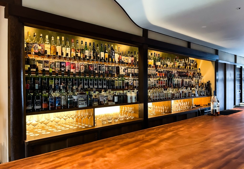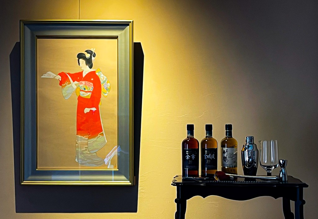 長板的吧台,酒吧盡頭是一片明亮的日式庭院,我坐在酒吧前,正前方則面對了一幅日本畫家女性畫像,這裡過去頗像是日式書院的味道。酒吧前方則是面對著豐富的烈酒,威士忌也相當的多。