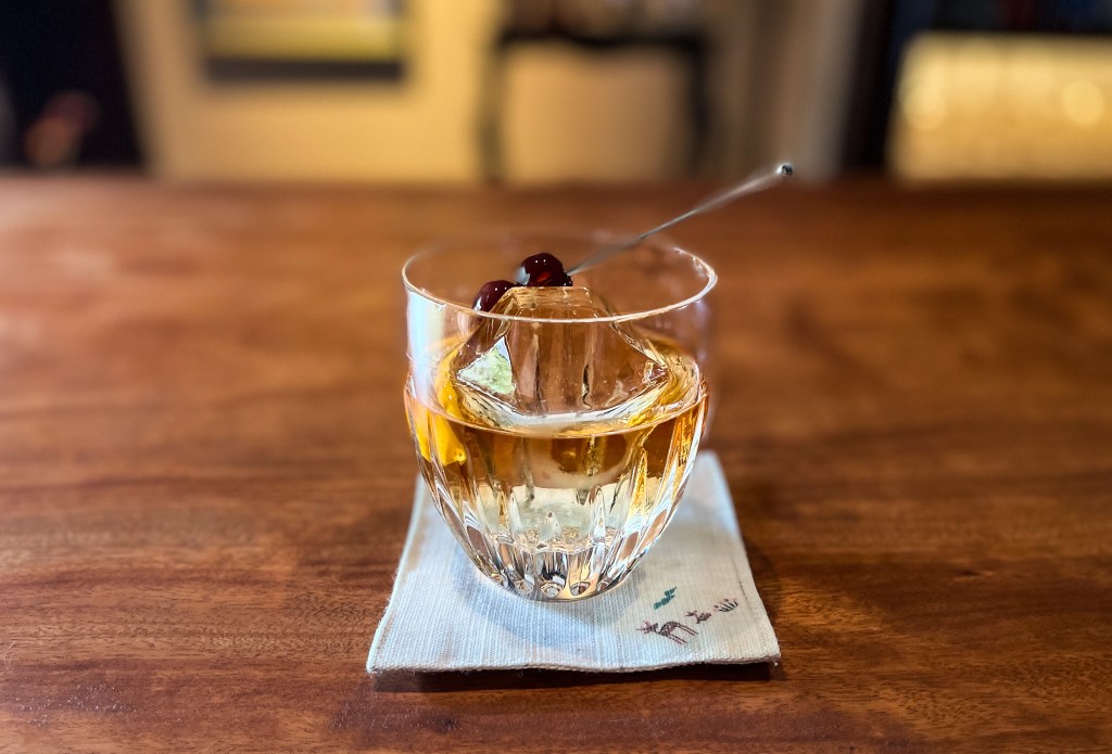 第一杯調酒,我選擇了一杯適合心情與氛圍的調酒的「OLD FASHIONED」(WHISPER PIG WHISKEY, SPICED WHISKEY, NARA BITTERS, ORANGE PEEL, CHERRY)。