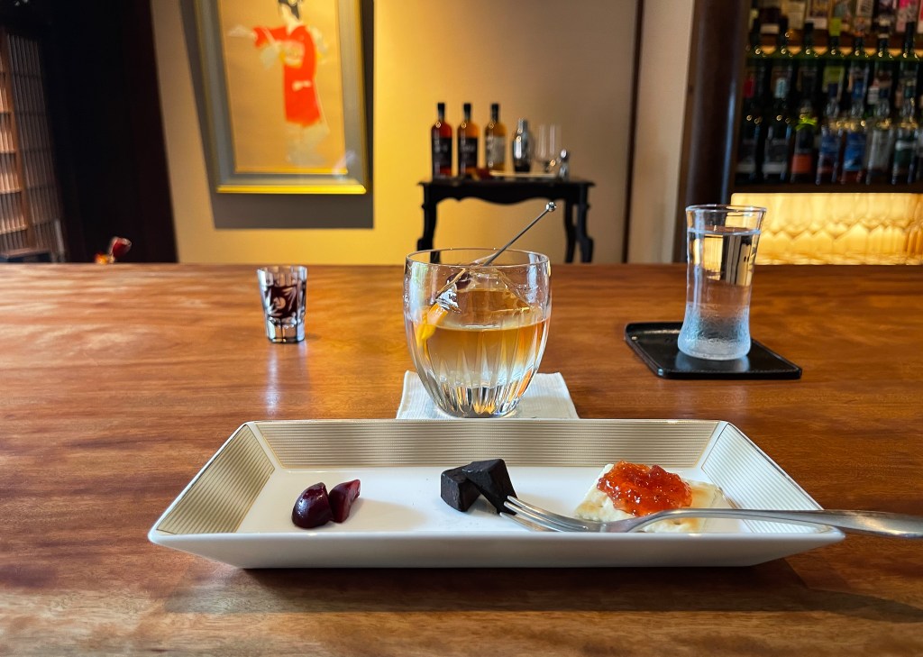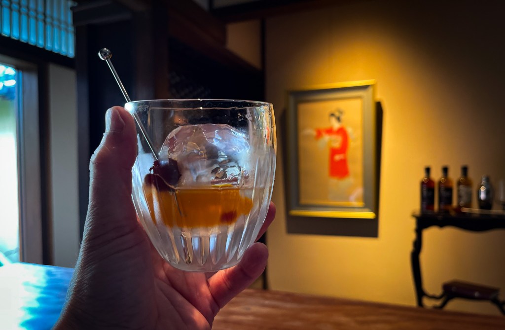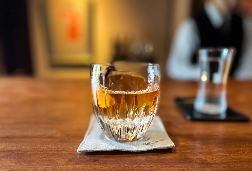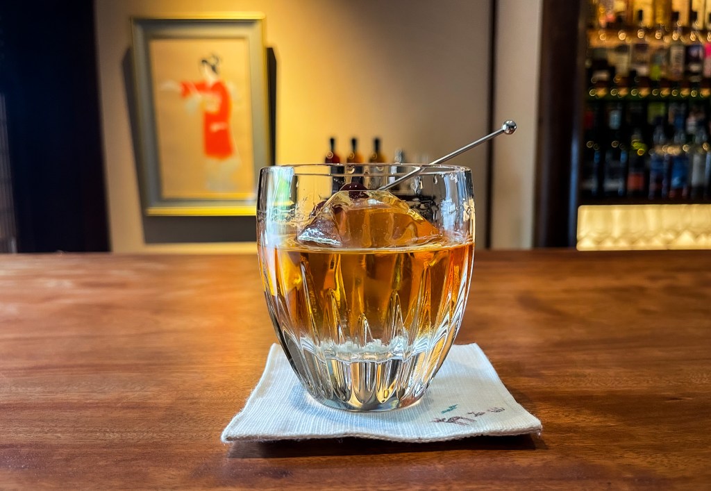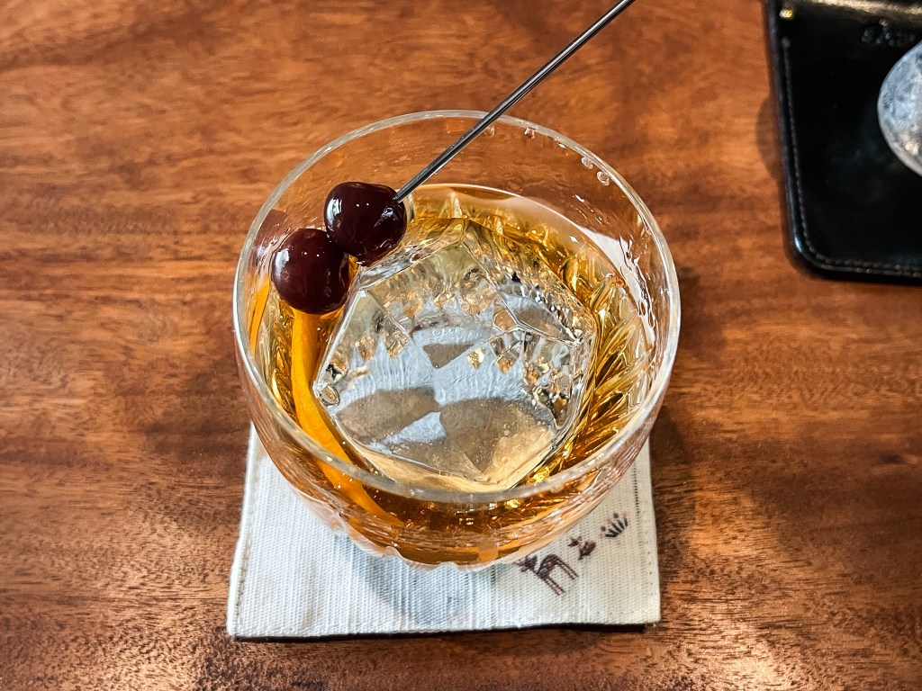 下午我就開喝了,看調酒師以Whisper pig波本威士忌作為基本威士忌,不過他也添入了一點風格較為辛口的Spiced Whiskey,然後用在地的奈良苦精,調製一杯兩款威士忌調和的老經典。