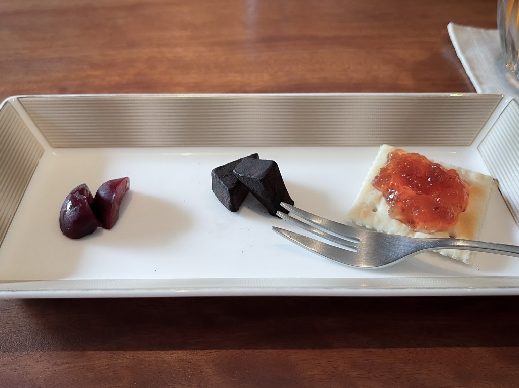 巧克力苦甜後味帶辛醺,但非常好吃。配上威士忌裂感降低,尾韻比較乾澀。有點草莓梅果的果醬餅乾,這種雖然我也常在家吃的,但在這吃的感覺特別不一樣也特別甜美優雅。