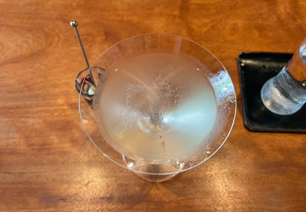 隨即再擠上檸檬油使得馬丁尼杯裡表現十分馨香的風味。俯瞰下這杯調酒,儘管霧霧的,表層浮上些許薄冰,感受到涼爽與清新的氣味了。