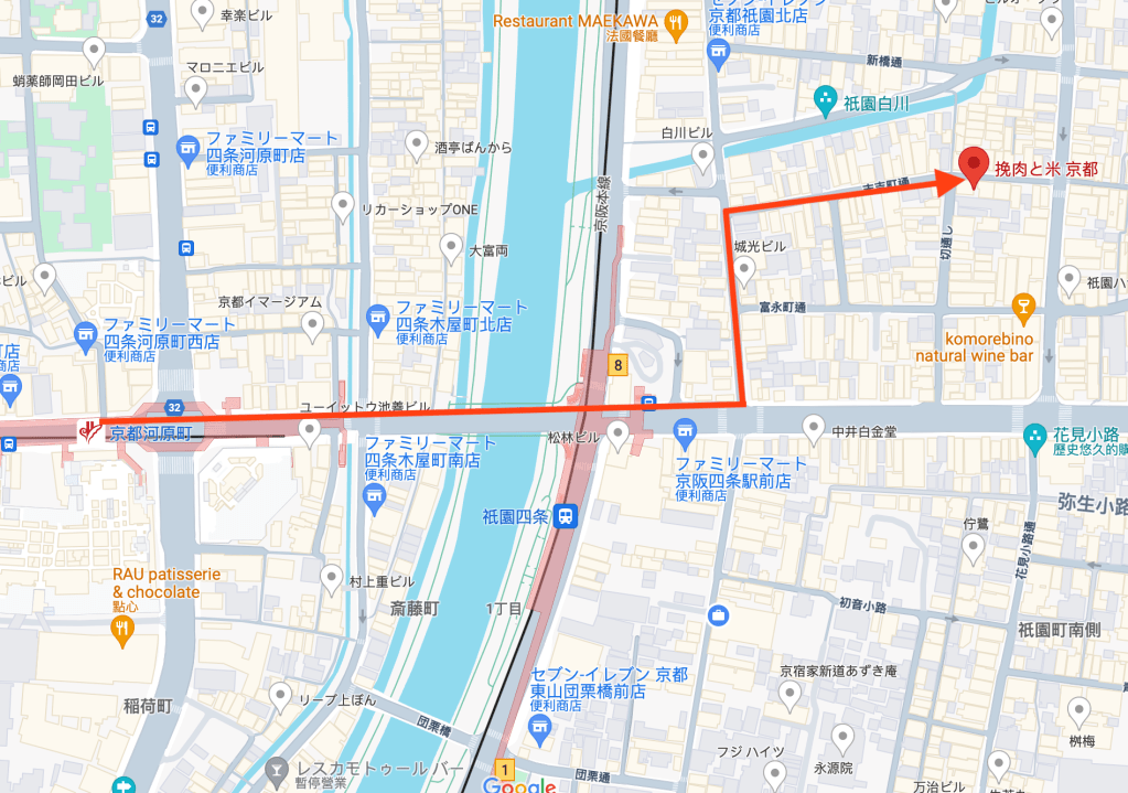 從京都市營地下鐵烏丸線京都站(K11,kyoto)→京都市營地下鐵烏丸線四条站(K13, Shijo)轉阪急電鐵京都本線烏丸站(HK-85, Karasuma)→阪急電鐵京都本線京都河原町站(HK-86, kyoto Kawaramachi)→挽肉と米 京都(34.59 N, 135.46E)。