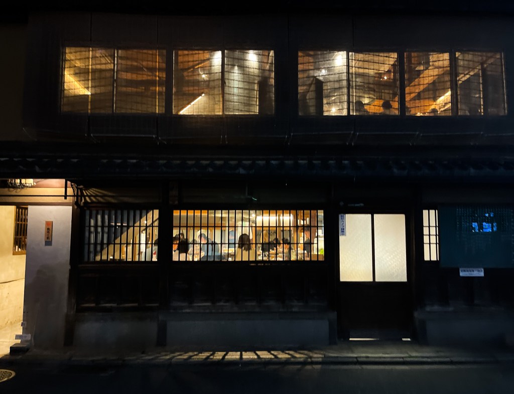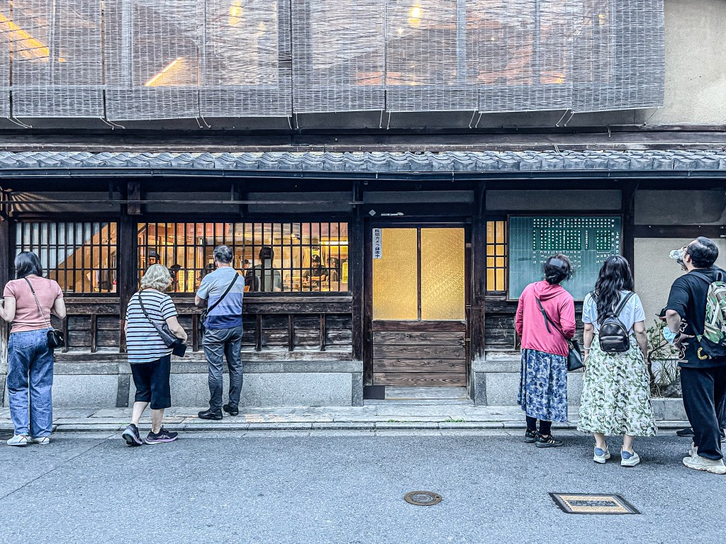 在候位時閒著也是閒著,我看見一個歷史小告示,這是在說明這棟建物的歷史。原來挽肉と米這棟建物曾經作為祗園甲部的藝伎與舞妓們的住所啊。在明治35年(約西元1902年)經過翻修成為一棟「檢番」的町屋。