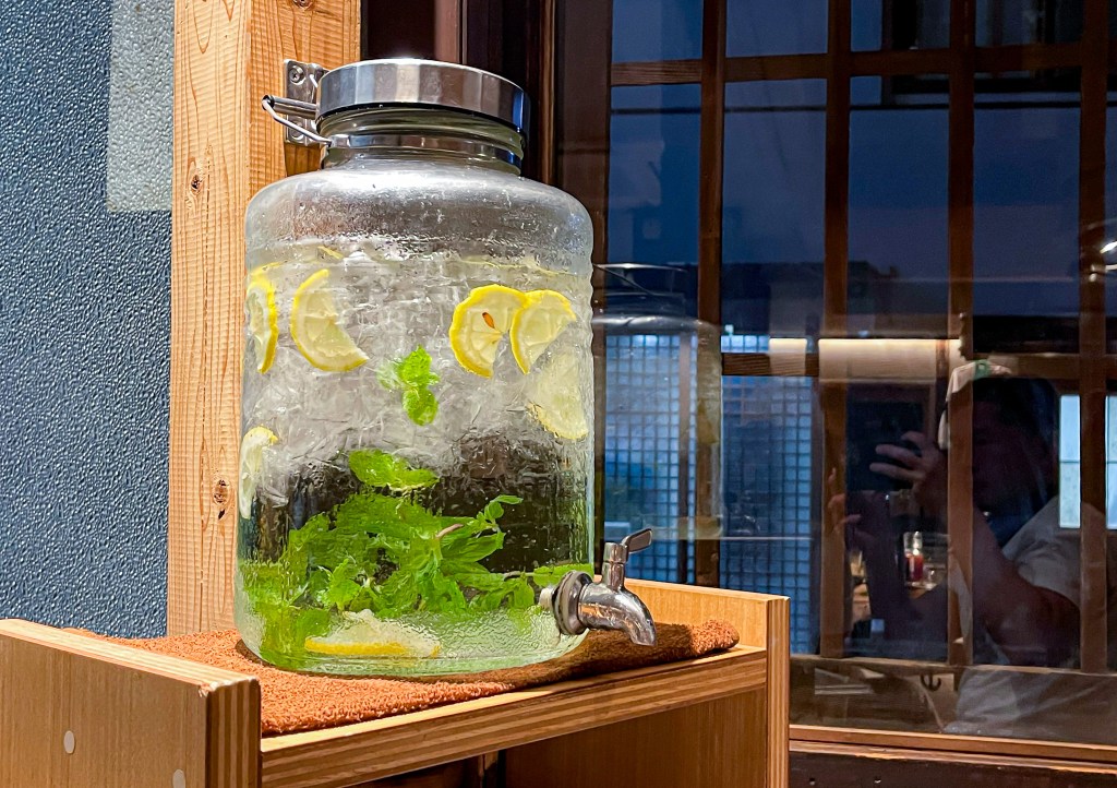 座位後方是可以裝盛水喝,而特別的是,這裡的水也是用香草與黃檸檬浸泡的帶著清新香氣的水,恰恰適合開始轉熱的京都。