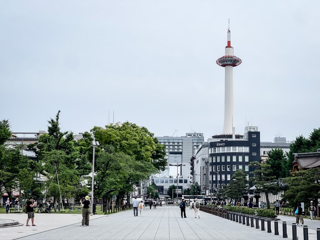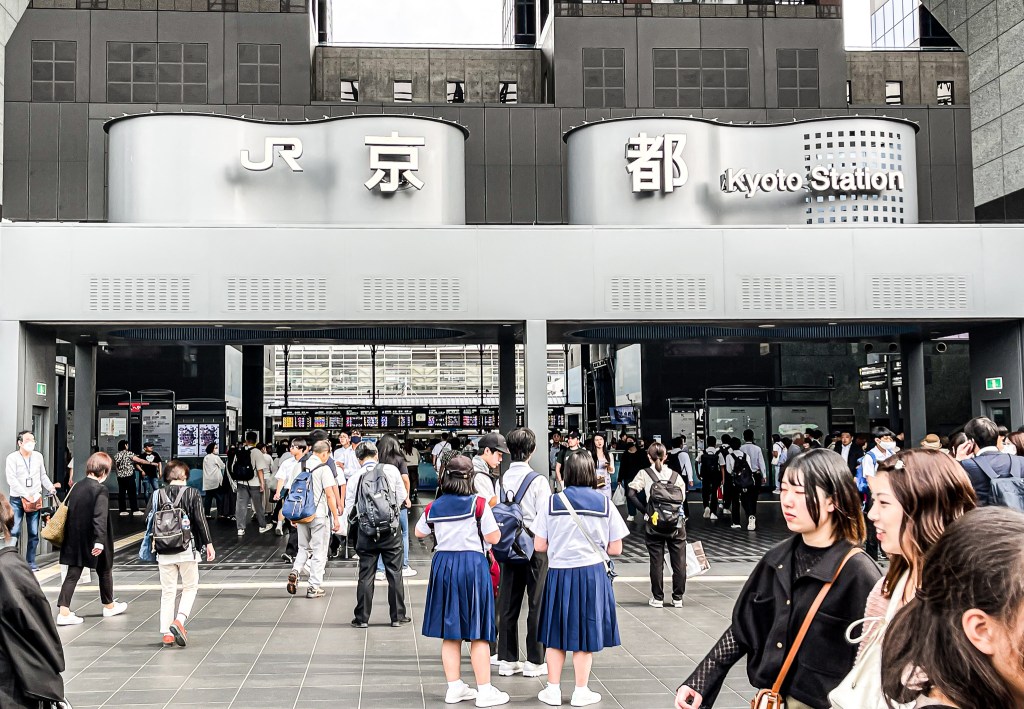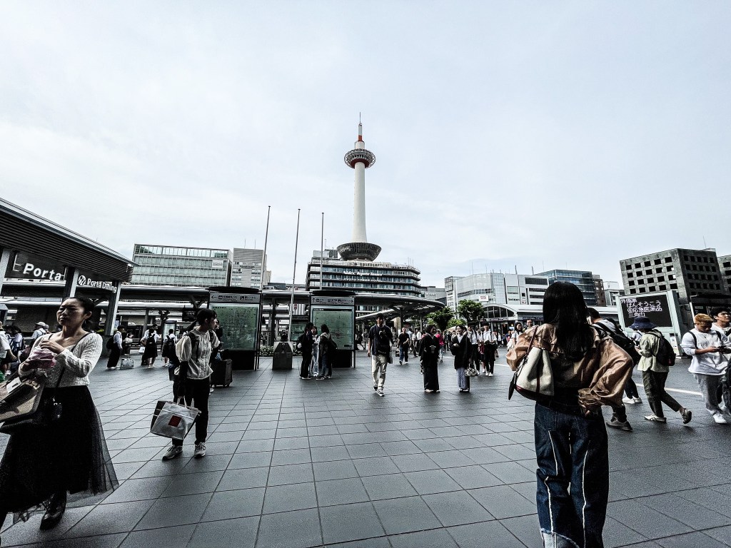 所應行李不種,我推著行李下了電扶梯出站,此時想,沒想到來到京都後發現人潮更多。我佇立在車站前方,人潮蜂湧,為了再次確認飯店位置,我滑一下了手機以確定方向。