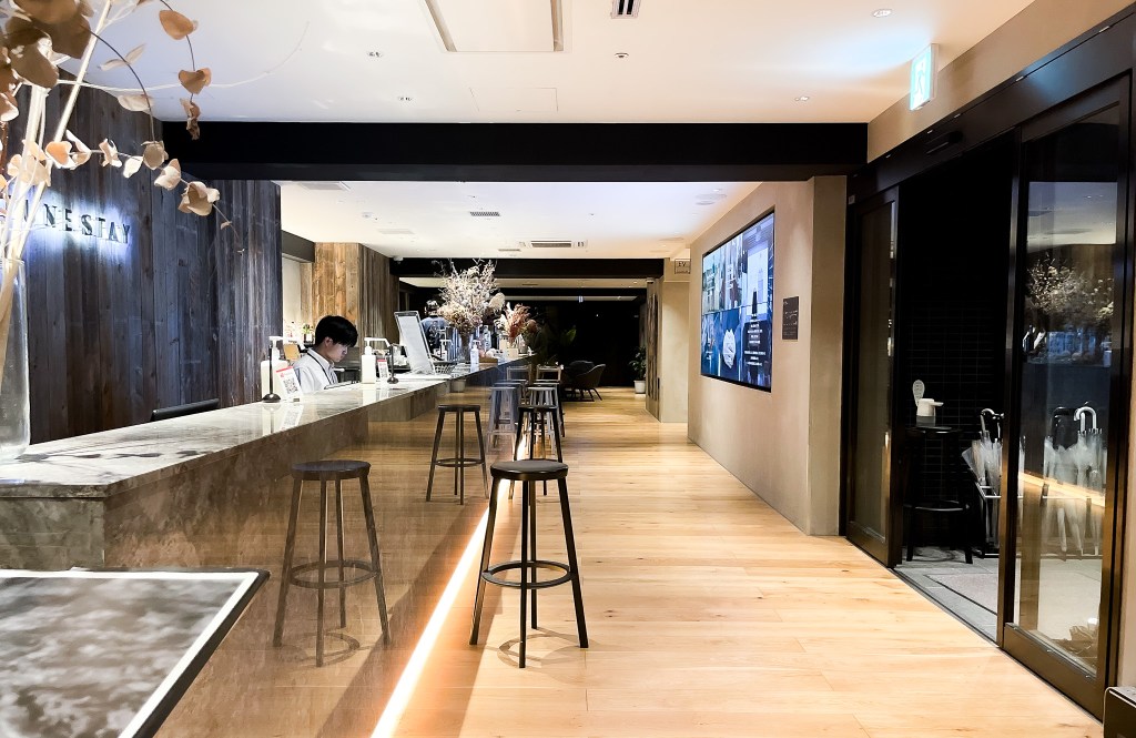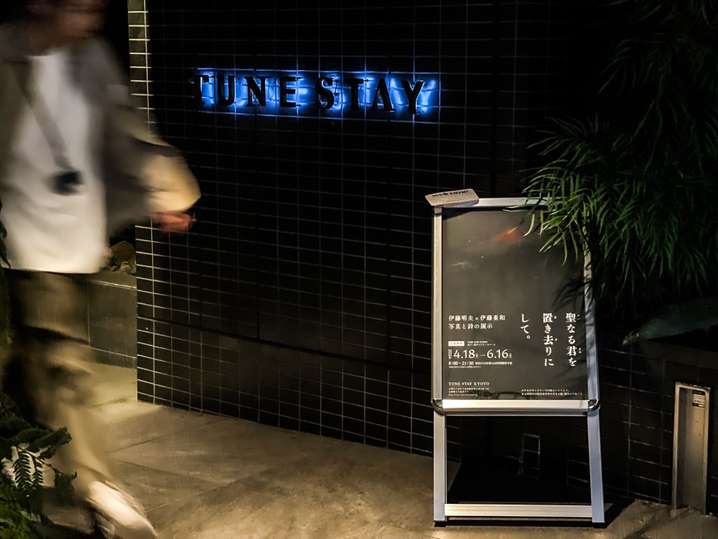 來到TUNE STAY KYOTO門口,我抬頭看上方也有個燈箱招牌,沒錯個定是這間了,我近去後是一處隧道長廊,到底左轉後自動門感應打開後,所面對的即是櫃台。