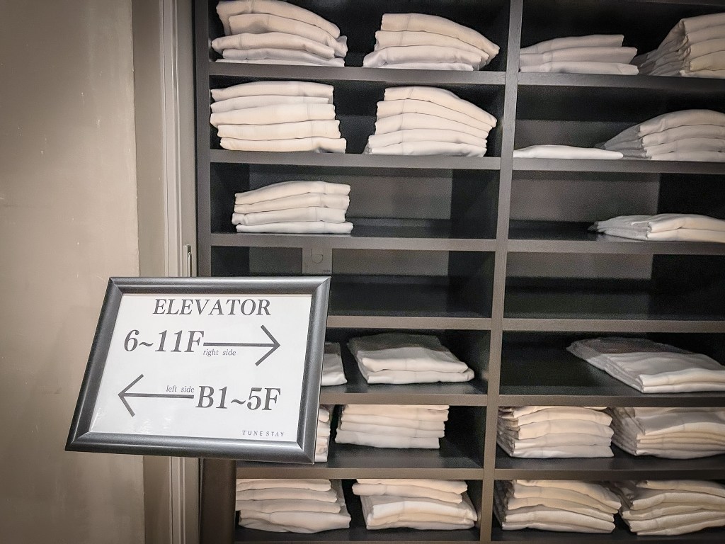 而電梯這裡也有個置物櫃臺,原來這是放置睡衣的櫃檯,倘若有需要用到睡衣,便可帶一件上去。