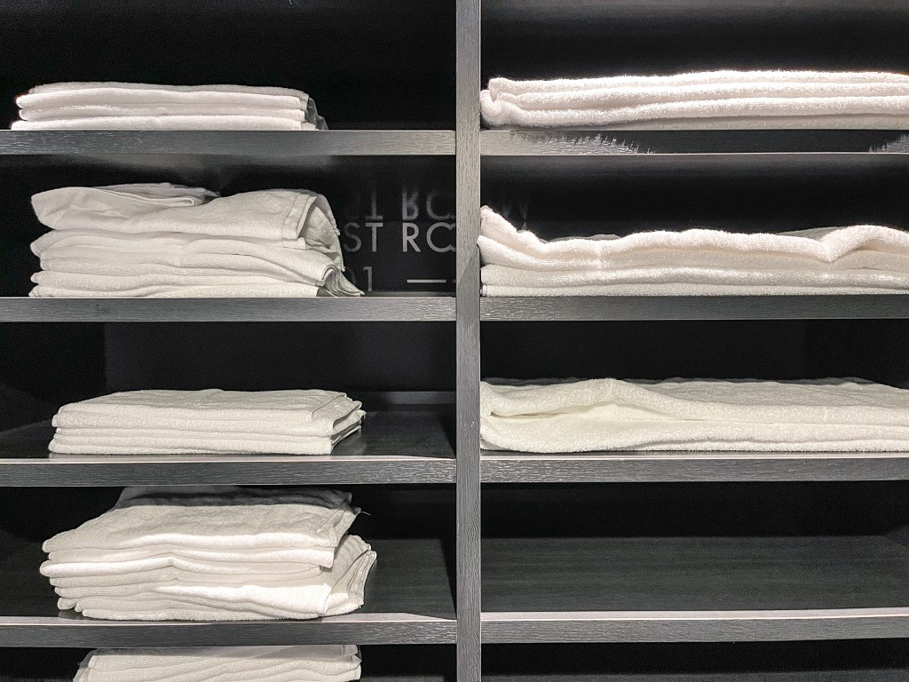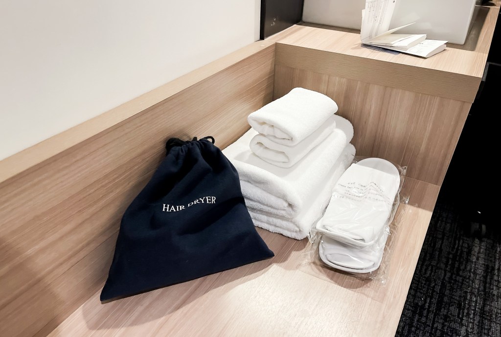 平臺上放置了浴巾毛巾以及吹風機,倘若不足或是需要替換,可放在門外電梯口的至物籃裡,當然也可以在平台上取用新的毛巾與浴巾。