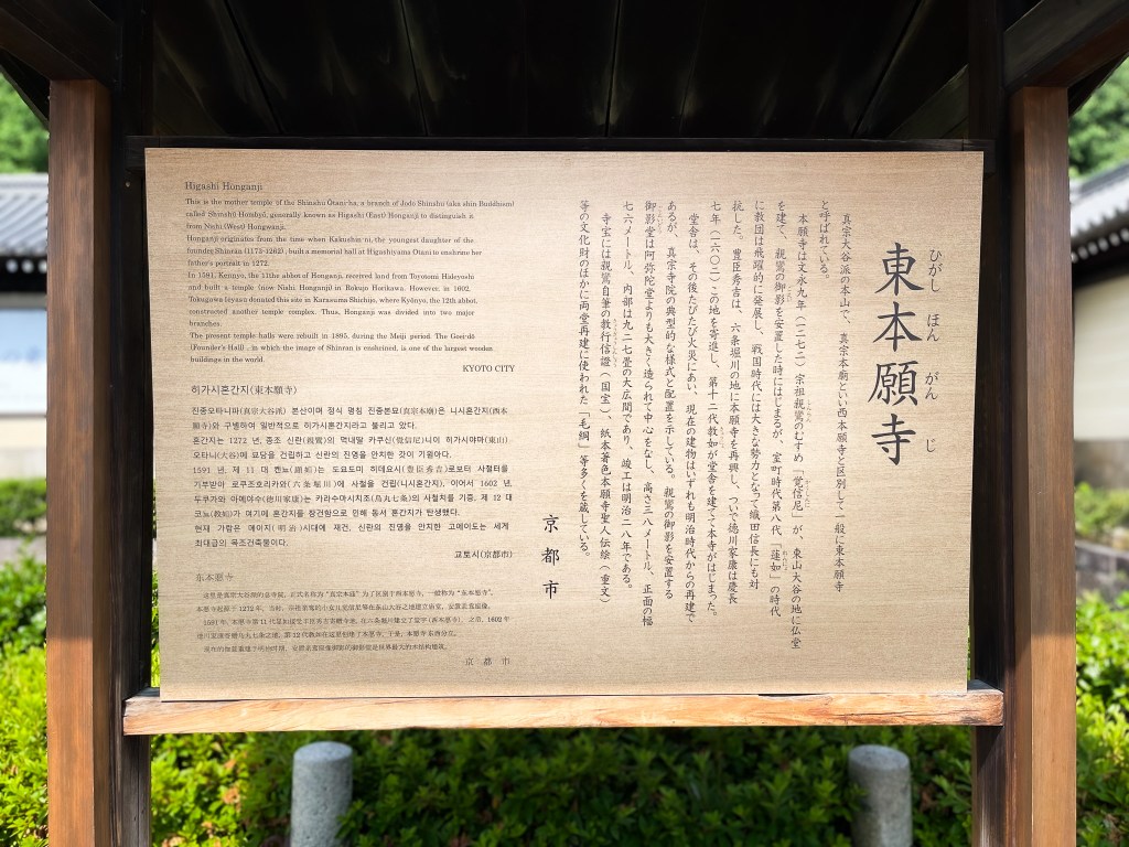 本願寺源起於13世紀1272年由宗祖親鸞(1173-1262)的小女兒「覺信尼」在東山大谷建造廟堂,安置親鸞座像。在16世紀1591年,本願寺第11代顯如接受豐臣秀古寄贈寺地,在六条堀川建立了堂宇(現為西本願寺),之後,在1602年時德川家康將位於烏丸七条之地(即現址)捐贈給了第12代教如並在此創立本願寺。
