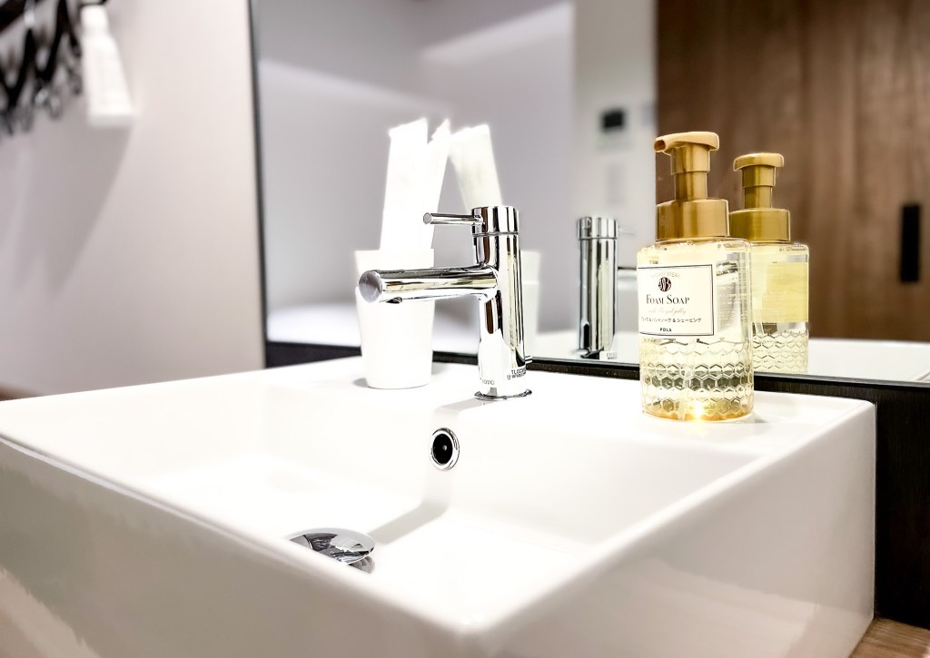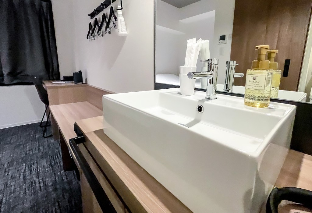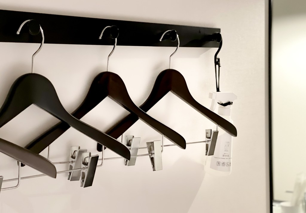 洗手台是無障礙空間,所以開水的時候不要過於大力,避免水會彈跳出來。另外在有限的空間下,鑲在牆上的有掛衣架設施,但仍然貼心的是,仍會掛上一罐除味噴霧提供使用。