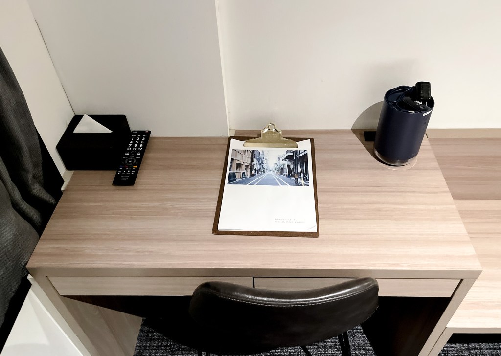 麻雀雖小,但五臟俱全,還有書桌提供使用,而書桌上有個加濕器,當然其目的就是抗乾,來日本發現,無論是冬天還是夏天,我的手總是會乾裂。