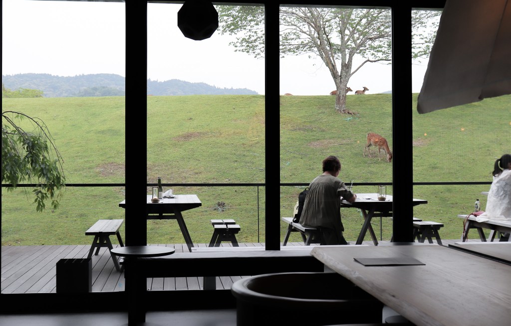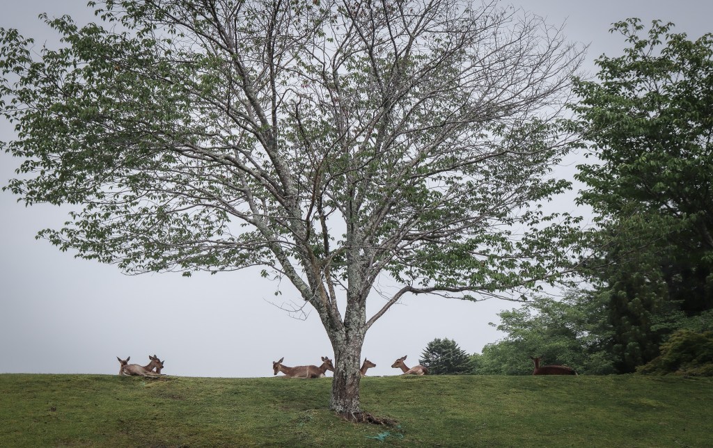 所以在沒有太陽的狀態下,這裡溫度自然是舒適涼爽的,尤其是看著邊際陵線,有許多慵懶的奈良鹿群在乘涼,在閒晃遊盪著。