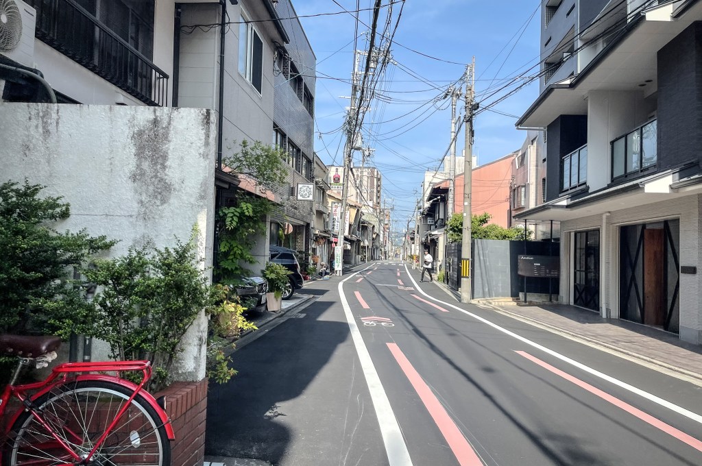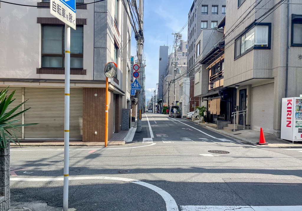 接著往前繼續前進,跑過第一個轉角,所見的前方路況比直,路雖不寬但也恰好可容納兩至三人的款度,這條路是竹屋町通。