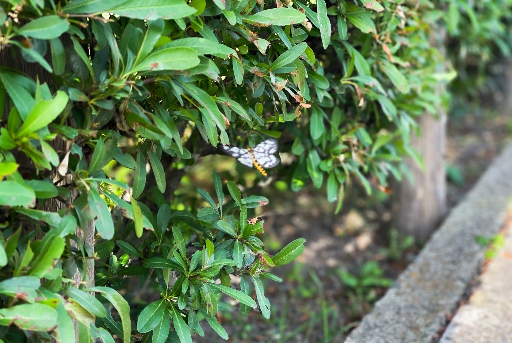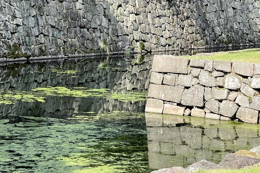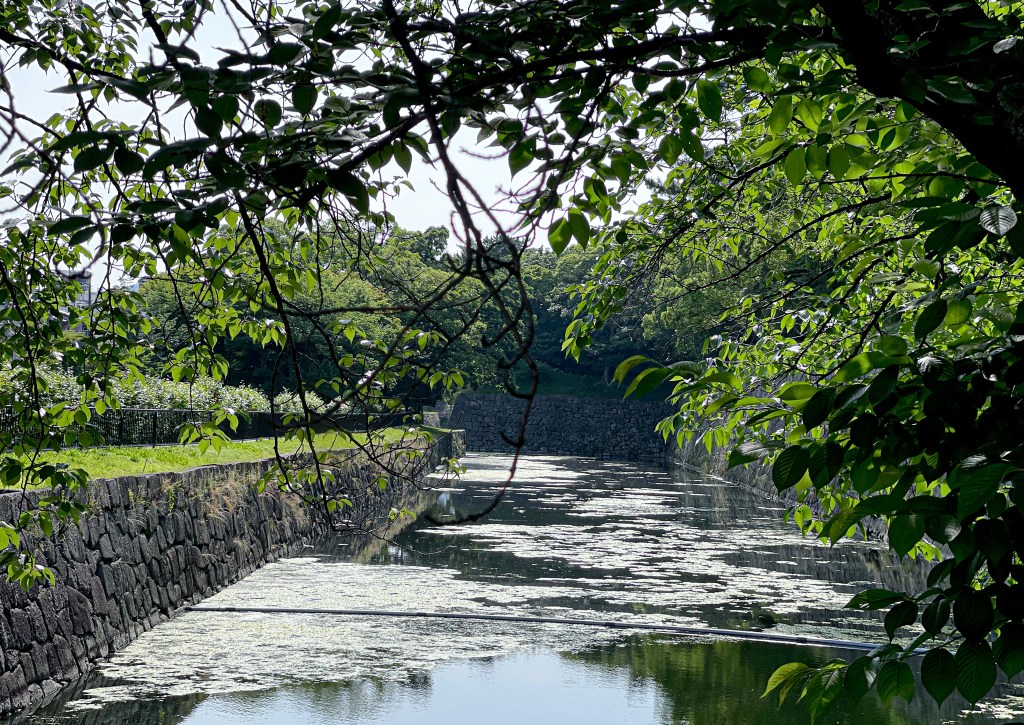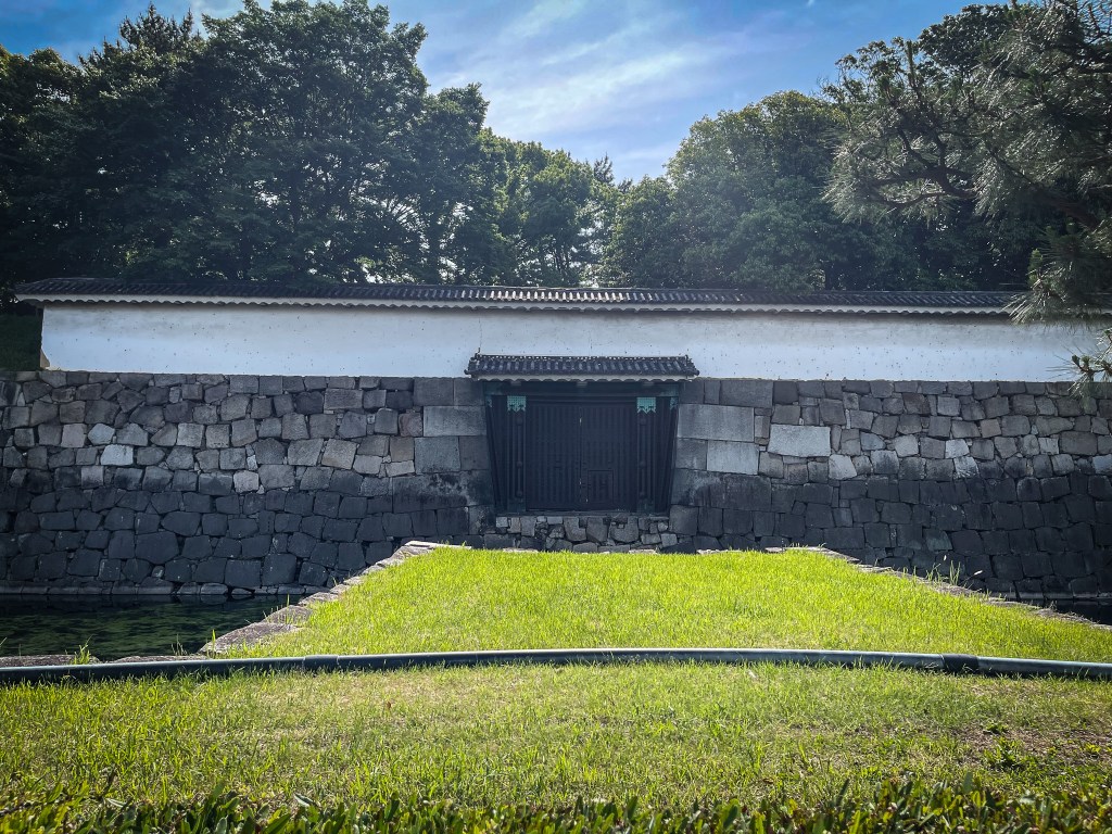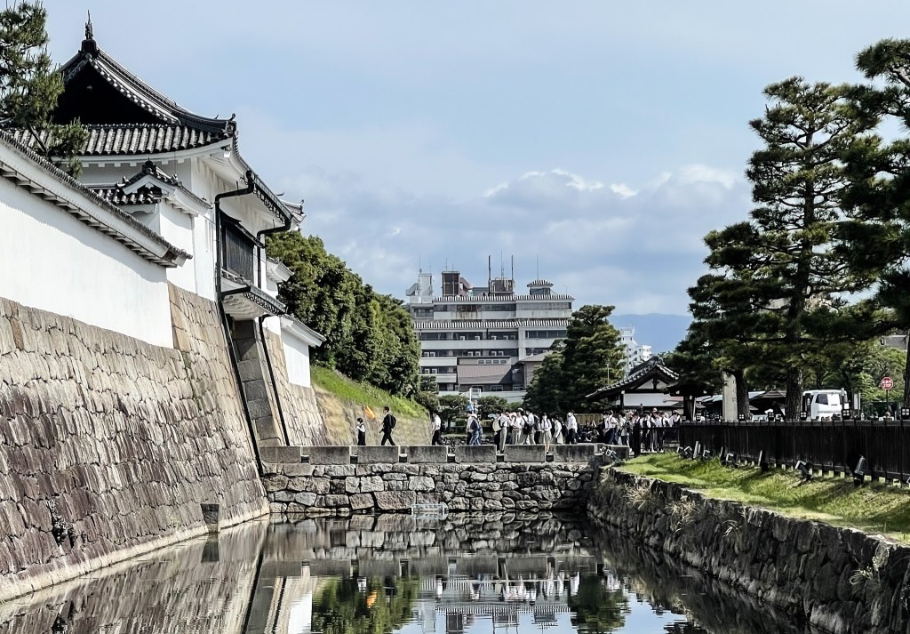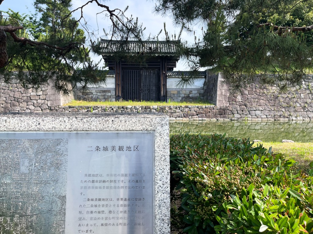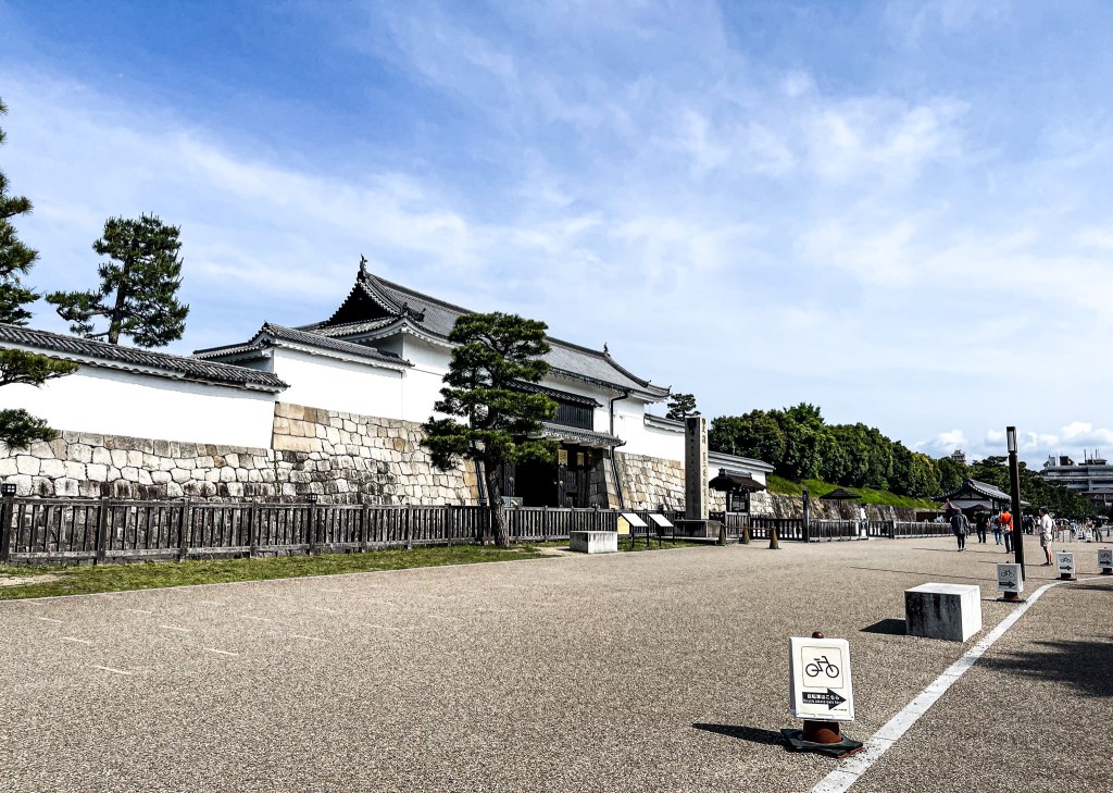 首先會經過北大手門,當然也會看見整條二条城也是由護城河所圍繞著,此外圍也有修整的整齊的綠色花樹圍繞,不時也看見許多小蝴蝶為輕舞飛揚著。