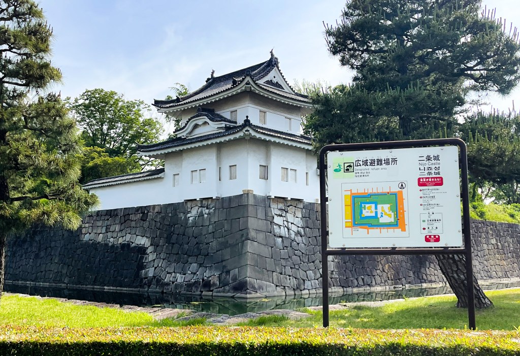 而這裡首先會經過西大手門,然後一路平順清靜,當到了前方轉角會發現如崗亭的小城所,喔..原來這叫「西南隅櫓」,所謂的櫓就是指城門上方的長型屋且為兩層式城門。此時想,剛到二条城時所過的馬路旁也有一個櫓,那便是「東南隅櫓」了。