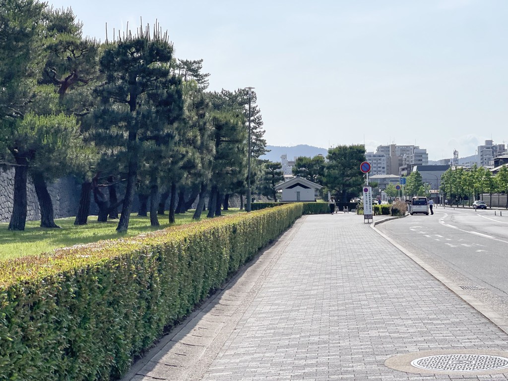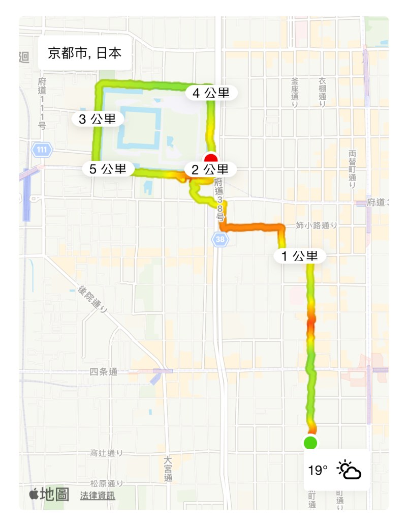 好的,今天設定的目標也是第一次跑的二条城。二条城,距離飯店概約為1公里多一些,二条城一圈尚不滿2公里,我估算從飯店跑步去,再跑兩圈,時間應該是可以滿足且今天只設定5公里,如此不會跑過時間也不會過頭,不影響中午以後多行程。