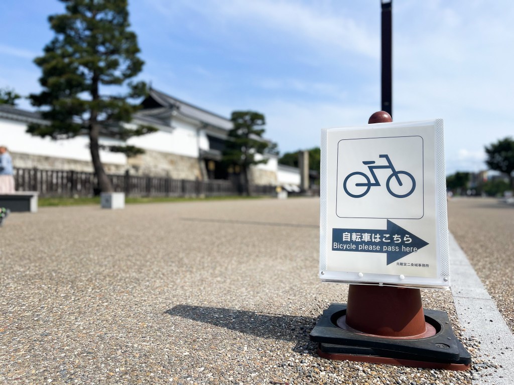 過了馬路,變成二条城大手門前方的道路跑前進,這裡的規劃很不錯,是人行道與腳踏車到分離,在往前方一點便看到哨所入口以及東大手門,在此可以看到前方有許多排隊購票入園的旅客正在這裡等待開園,我看一下時間,原來0845才能入園。