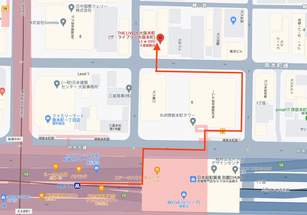 搭乘中央線來到堺筋本町站,我看了一下Google地圖的位置,方向應該是從1號出口出去。Bingo,沒錯,走對了而且一個轉角就看見了THE LIVELY OSAKA HONMACHI。