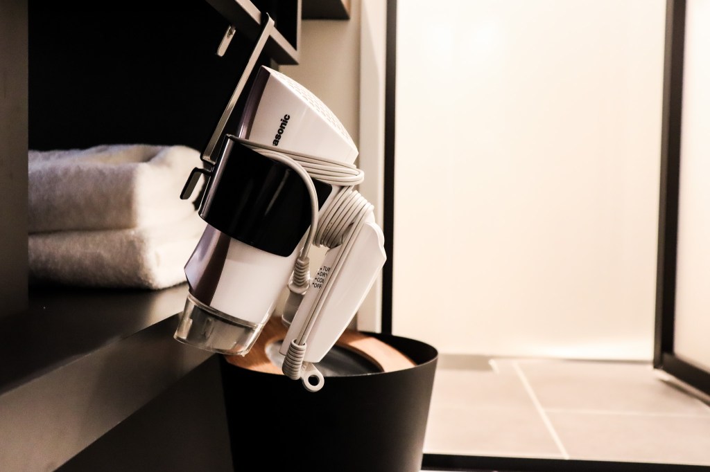 此外洗手台以及相對提供的浴巾、吹風機、馬桶等等,都設置在門外,換句話說是走一個開放式的方式,當然上頭有窗簾,也可以拉上成為一種區隔,使這塊區域成為獨立的化妝室。