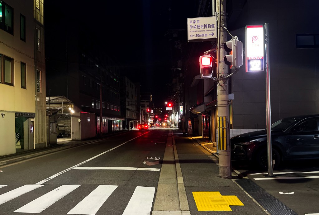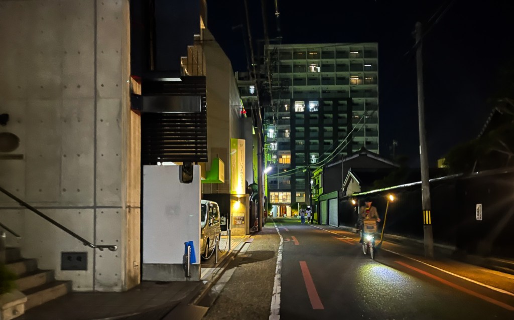 我再從河原町慢慢的散步而隨著Google地圖走進了中之町,在沿路進入佛光寺通,這裡的人煙逐漸稀少,街道燈光也逐漸暗淡而寂靜。