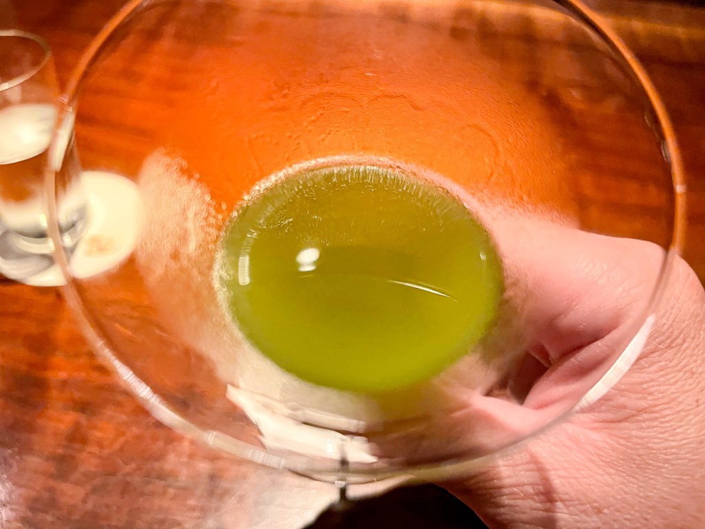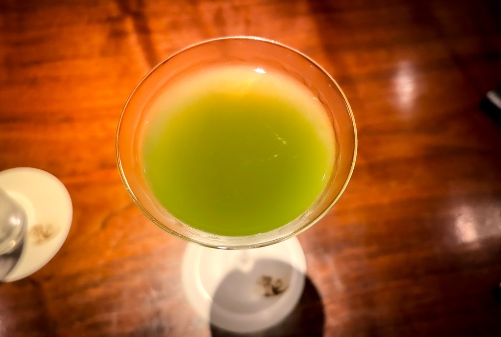 果然是京都風味馬丁尼,呈現出一種讓我誤以為是甘蔗汁的感覺,我聞著氣味,嗯嗯..表現出清楚的但在冰涼擁抱下的抹茶味。而這種抹茶味我會誤以為是松子,對炒爆香的松子味。再仔細聞一下,不知道是不是看什麼像什麼大腦會計下什麼,有一種竹子,像竹桶飯那種竹子殻的味道。
