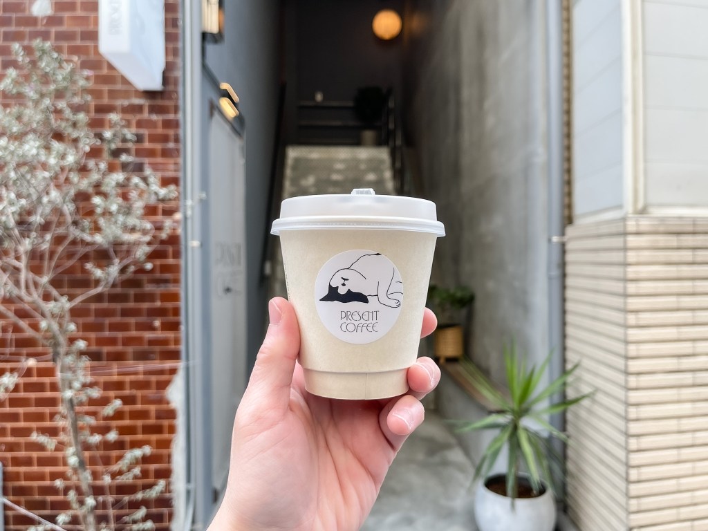 “With a cup of coffee in …